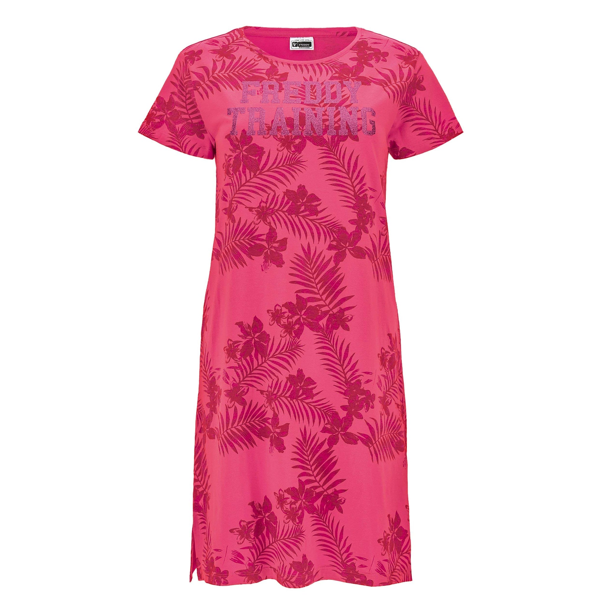 Abito a maniche corte in jersey di cotone leggero a fantasia tropicale con stampa glitterata FREDDY TRAINING. Capo con vestibilità regular, scollo a girocollo e fondo dritto con piccoli spacchi. Al suo design confortevole, che segue morbidamente la silhouette, si unisce il mood estivo dato dalla fantasia tropicale e il lettering in glitter per un look estivo all'insegna della comodità e libertà di movimento.