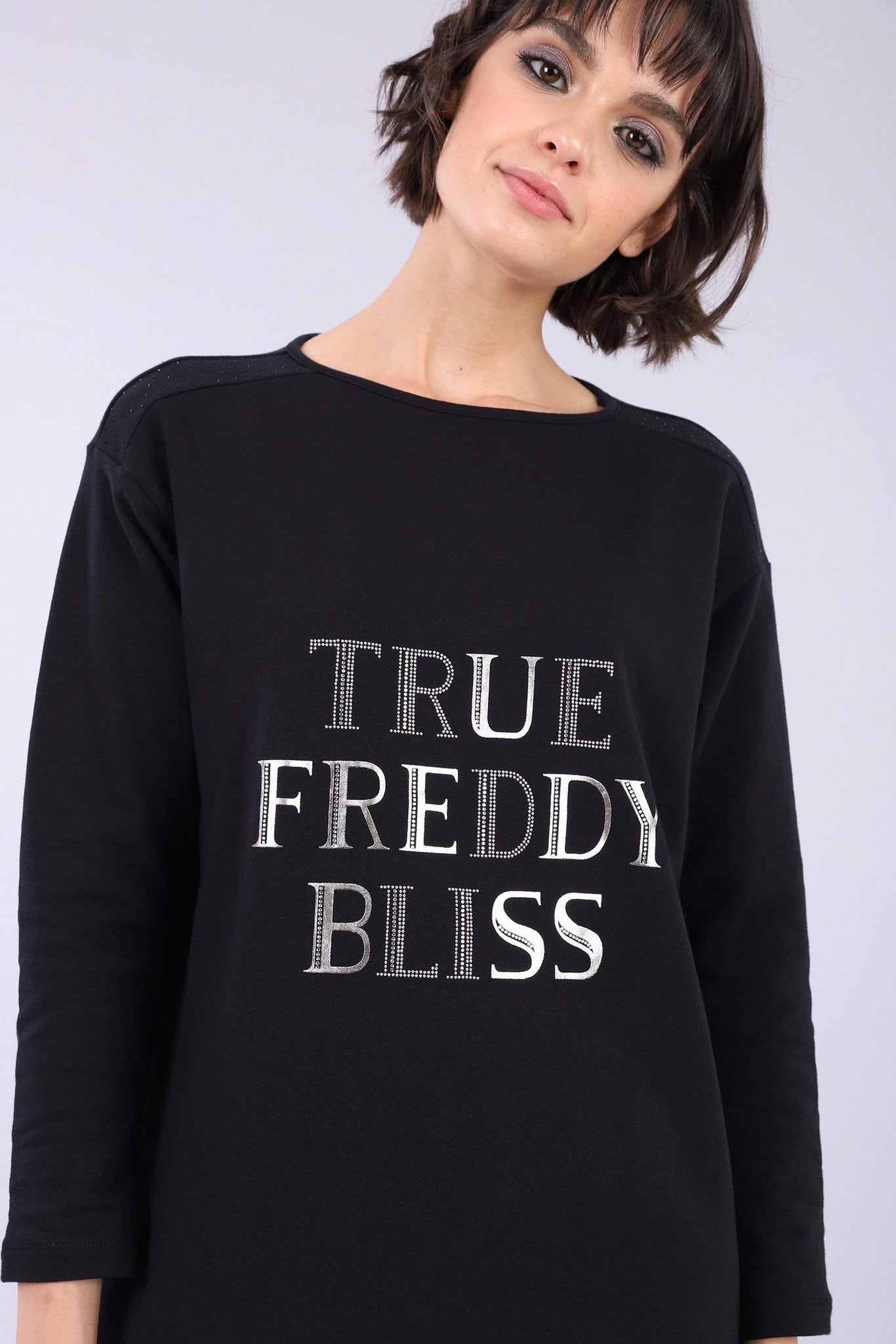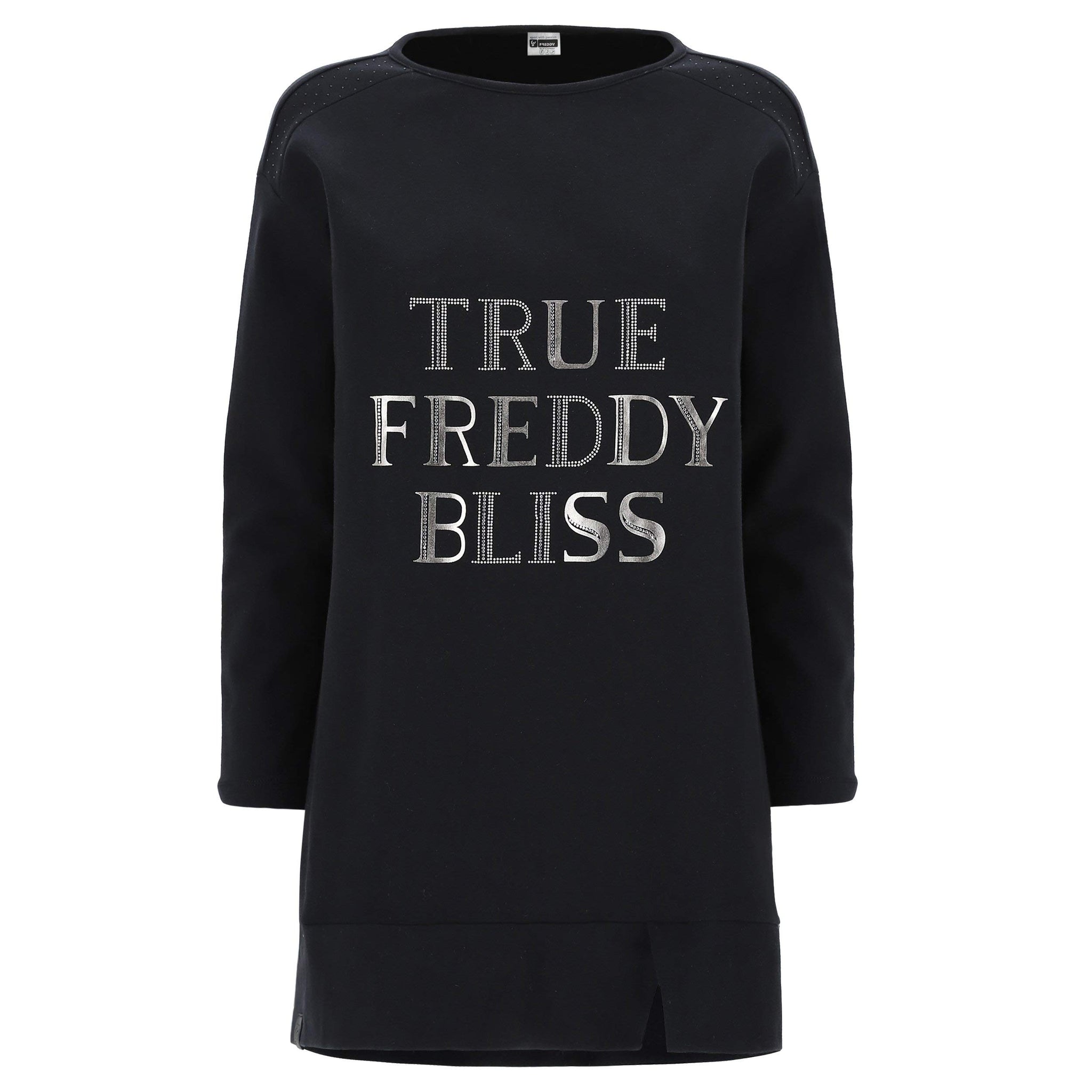 Il modello, con maniche dritte e scollo a girocollo, è decorato da strass su spalle e fronte e dallo slogan stampato a contrasto in argento sul petto.