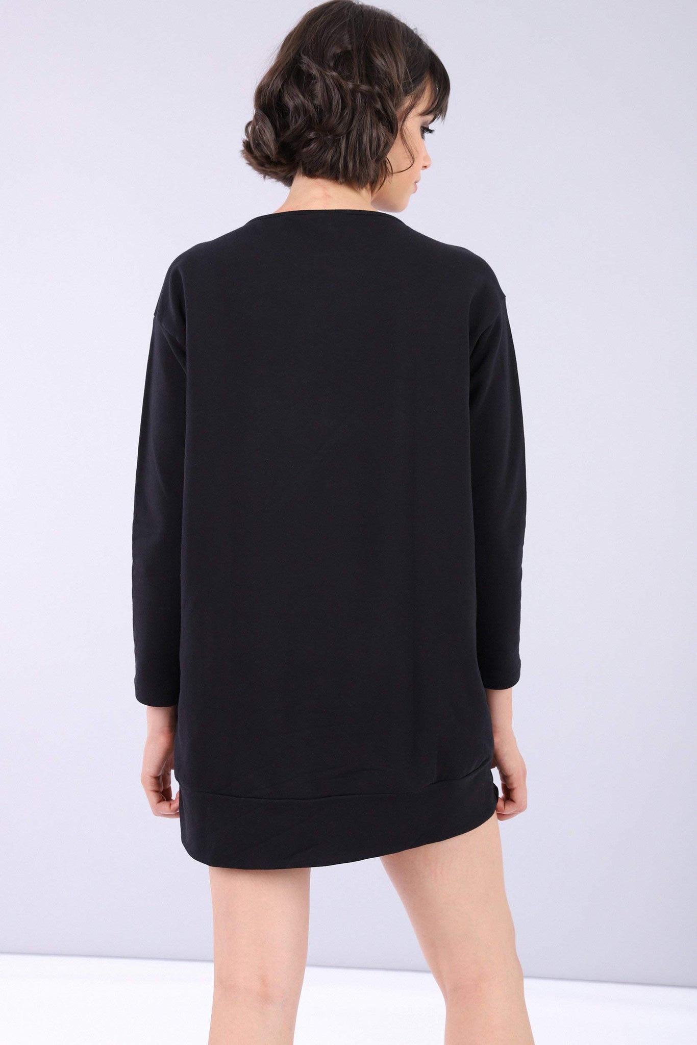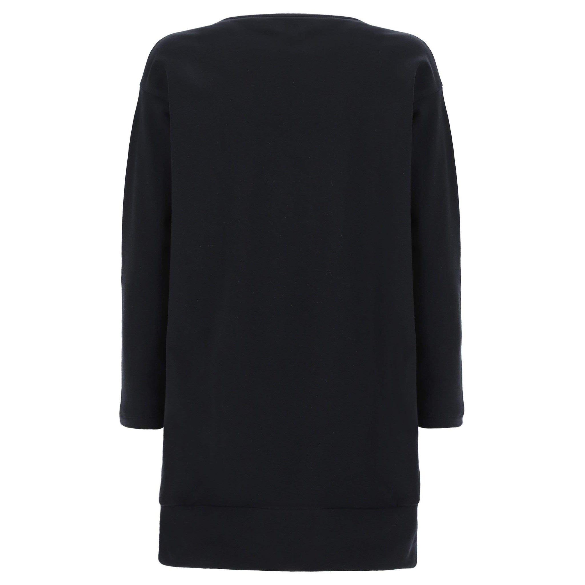 Abito nero in felpa dalla vestibilità comfort, con spacco sul fondo che lascia intravedere l'interno doppiato in tessuto a stampa animalier.