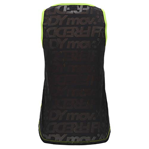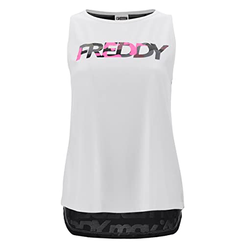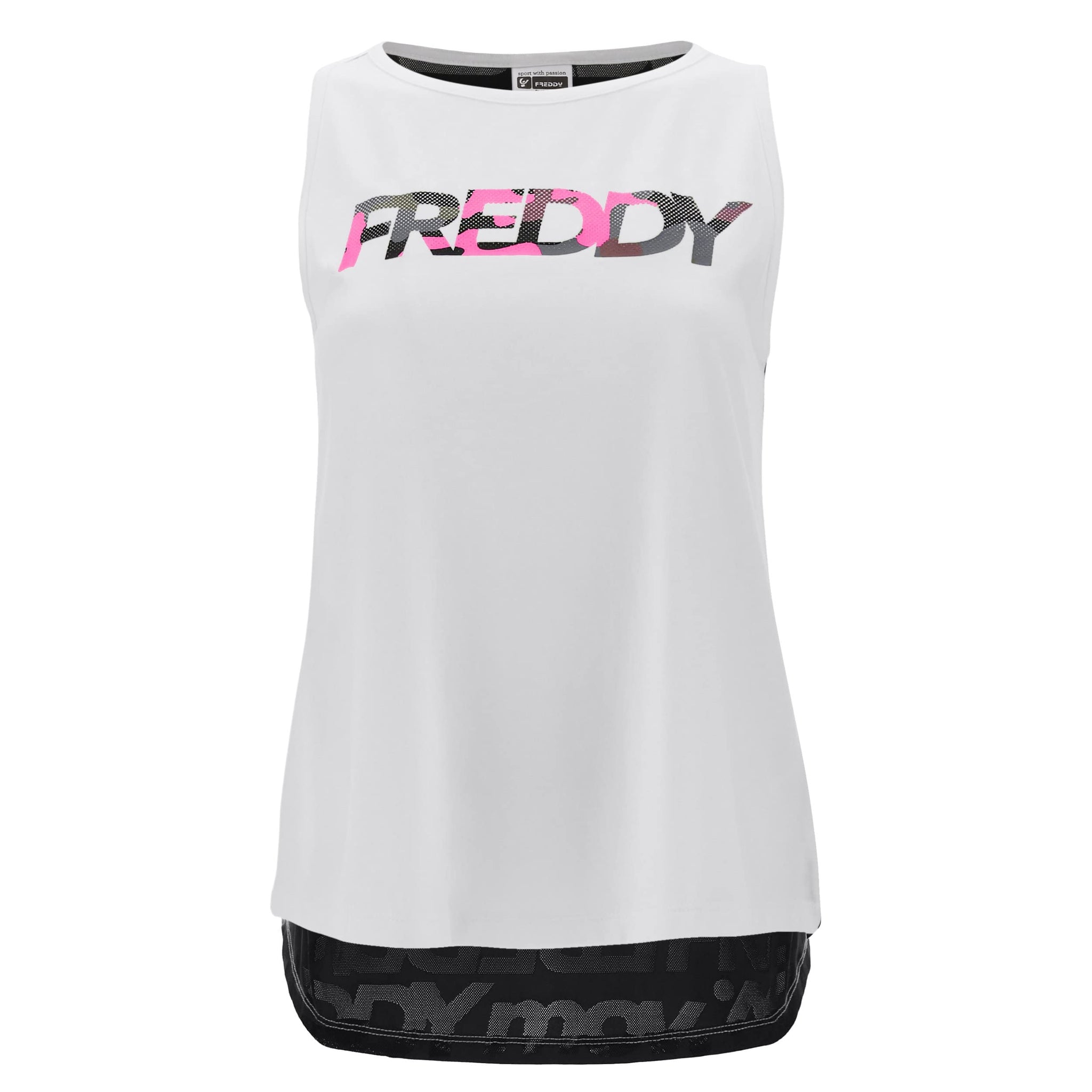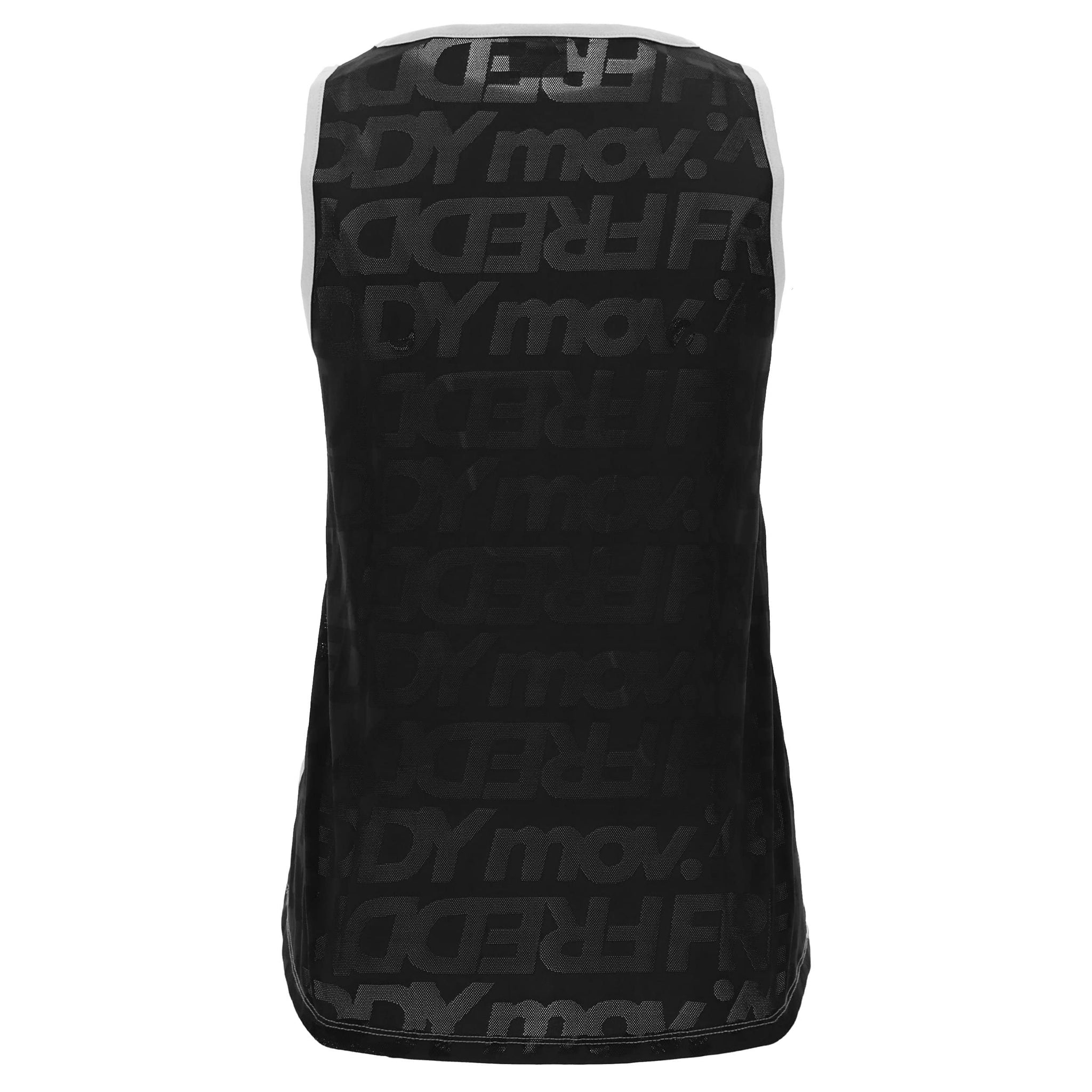 Canotta fitness con vestibilità comfort in jersey modal con retro in mesh nero logato FREDDY MOV. Ha scollo a girocollo, spalline larghe con giromanica ampio e fondo leggermente svasato. La parte posteriore è leggermente più lunga e con il fondo arrotondato. Una stampa con logo Freddy dai colori a contrasto sul fronte esalta il suo animo active. Capo ricco di dettagli di stile e ideale per la pratica di sport intensi grazie al suo design che favorisce ampiezza di movimento e la combinazione dei tessuti che dona comodità e traspirabilità.