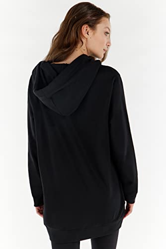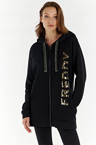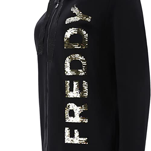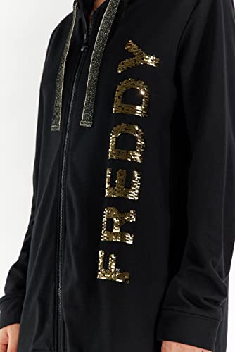 Felpa nera con cappuccio impreziosita dal grande ricamo frontale verticale FREDDY in paillettes. Il modello presenta cappuccio doppiato e regolabile con maxi coulisse con filo lurex, zip a tutta lunghezza in tono colore e tasche interne. Capo che esprime appieno il piacere per la libertà di movimento che non rinuncia allo stile grazie alla vestibilità comfort che si unisce al tessuto in felpa garzata elasticizzata nel sottolineare la comodità di questo capo versatile ricco di personalità.