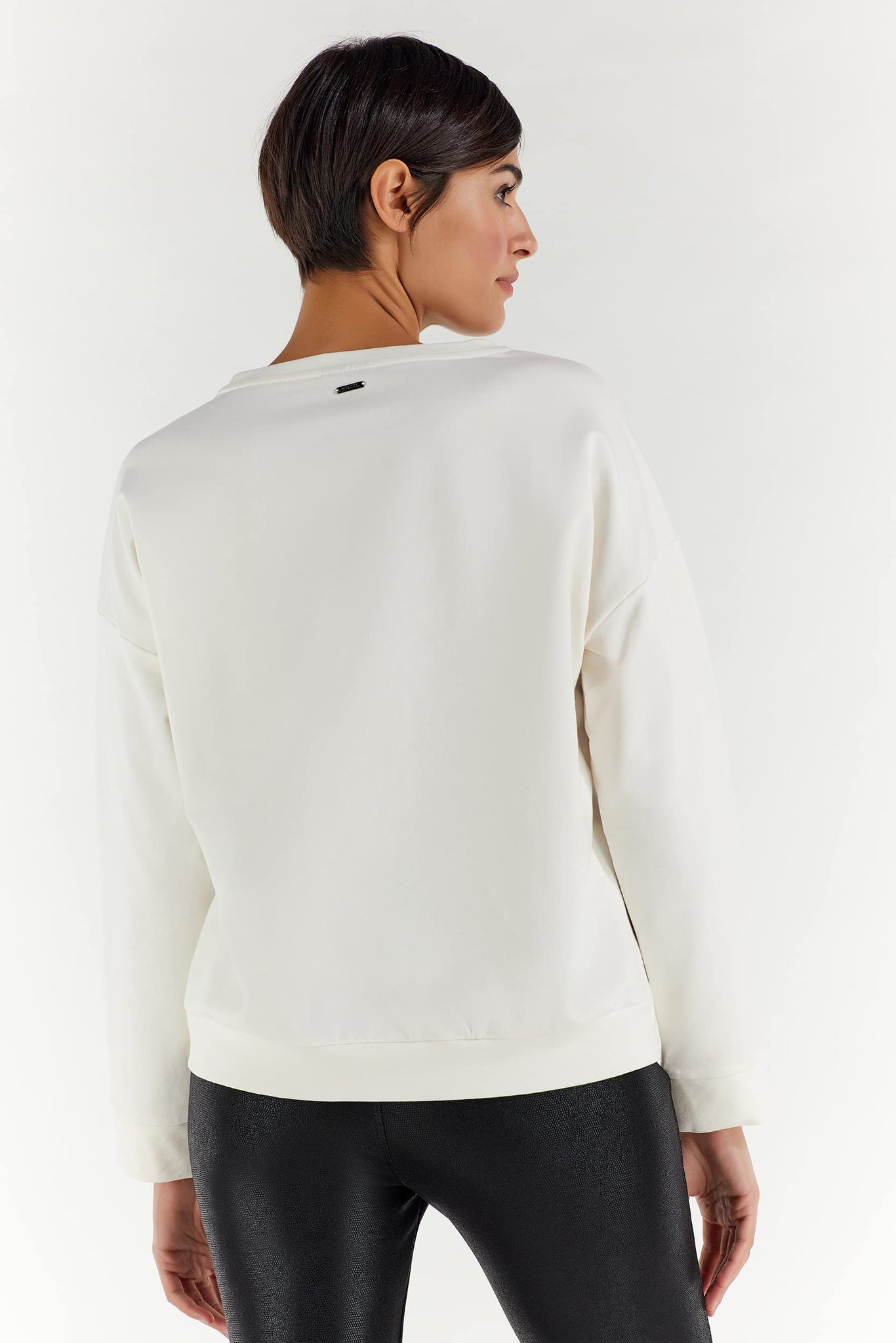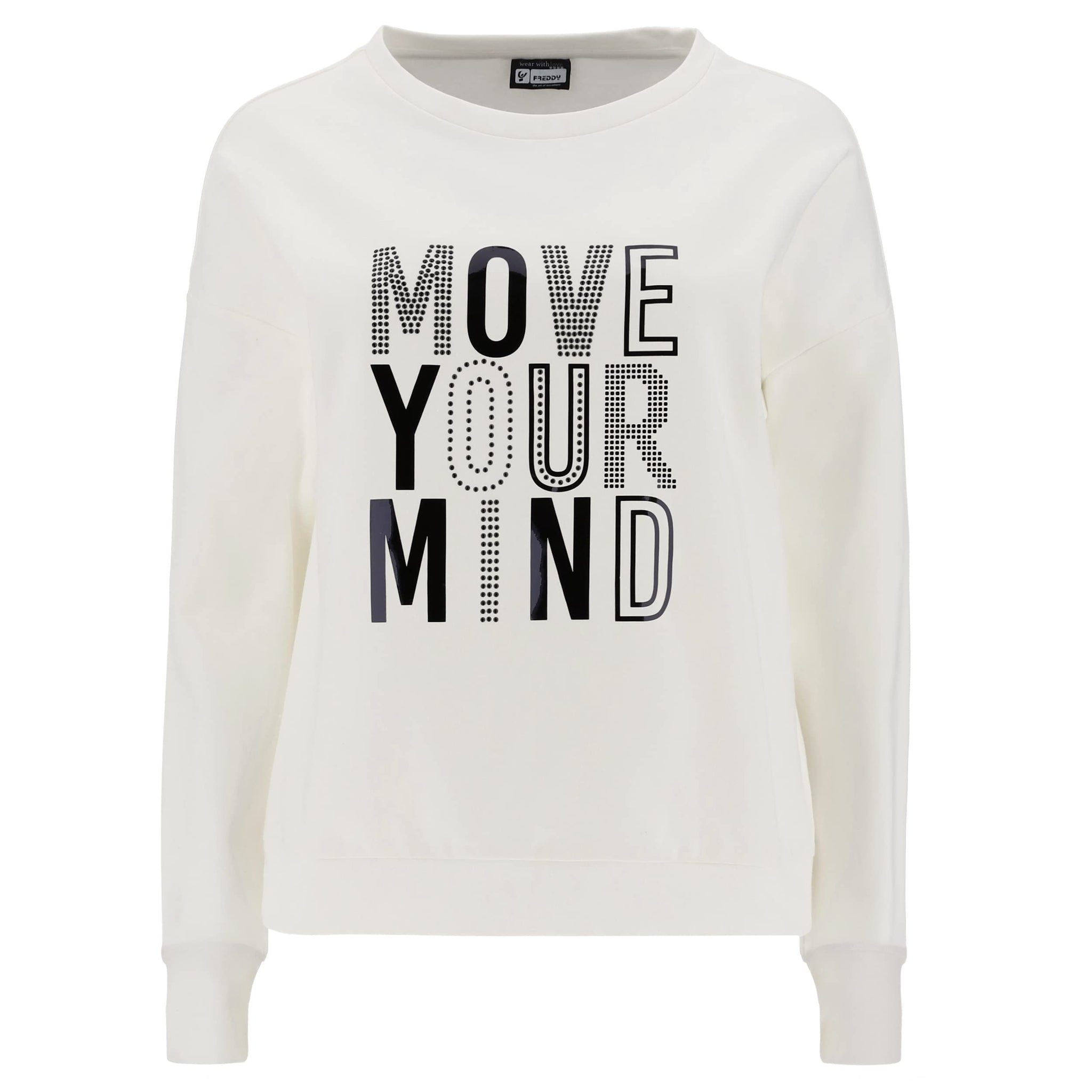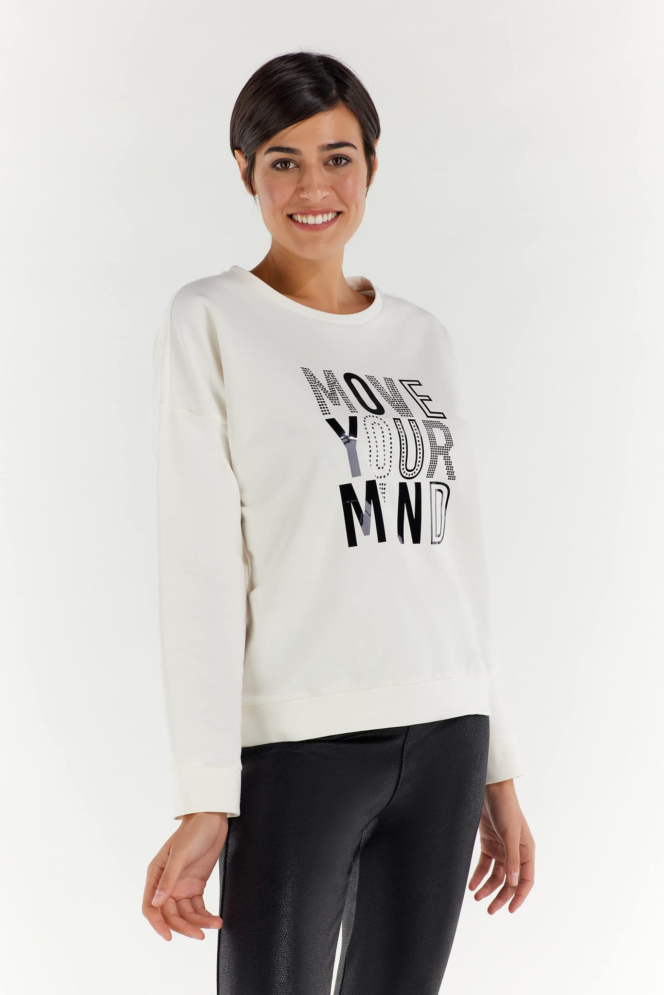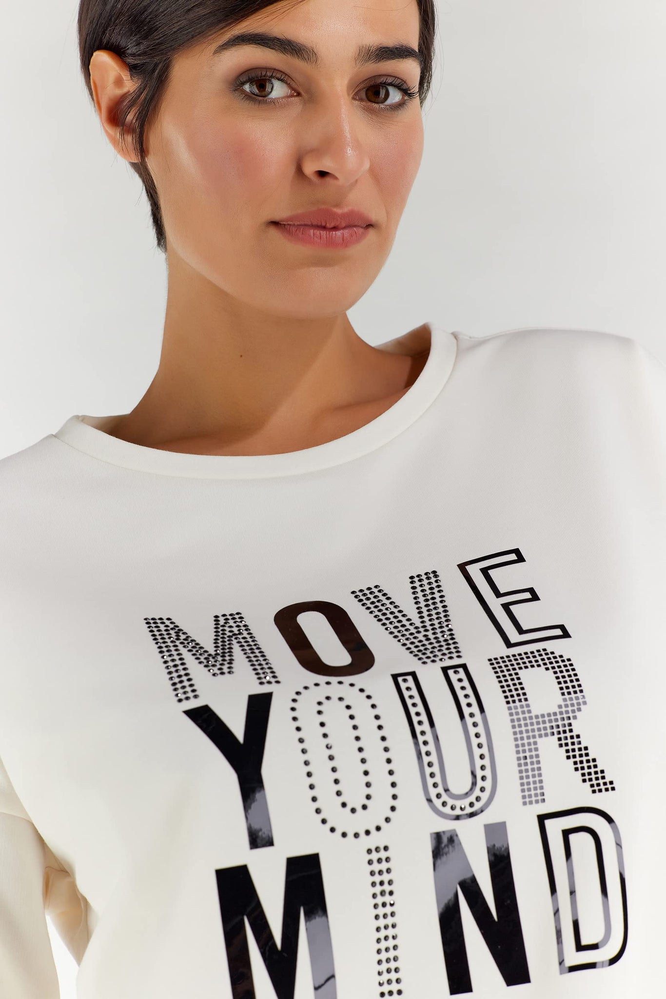 Felpa comfort fit impreziosita sul fronte dalla grande stampa MOVE YOUR MIND realizzata con strass e mylar argentato. Ha scollo rotondo, manica con girospalla sceso e polsino con elastico interno. La vestibilità ampia si unisce alla morbida flessibilità del tessuto in felpa garzata elasticizzata nel donare libertà ai movimenti, valorizzati dall’energia stampa dal tono motivazionale. Capo perfetto per accompagnare i tuoi outfit sportivi e per il tempo libero dinamico che amano la comodità e prediligono lo stile.