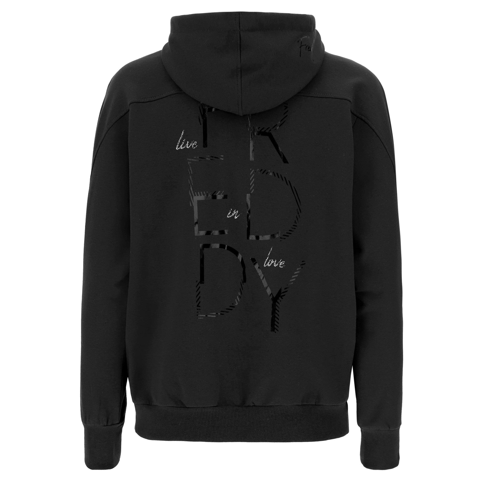 Decorazioni a stampa con il piccolo lettering Freddy sul lato del cappuccio e il grande lettering grafico FREDDY - Live in Love sulla schiena.