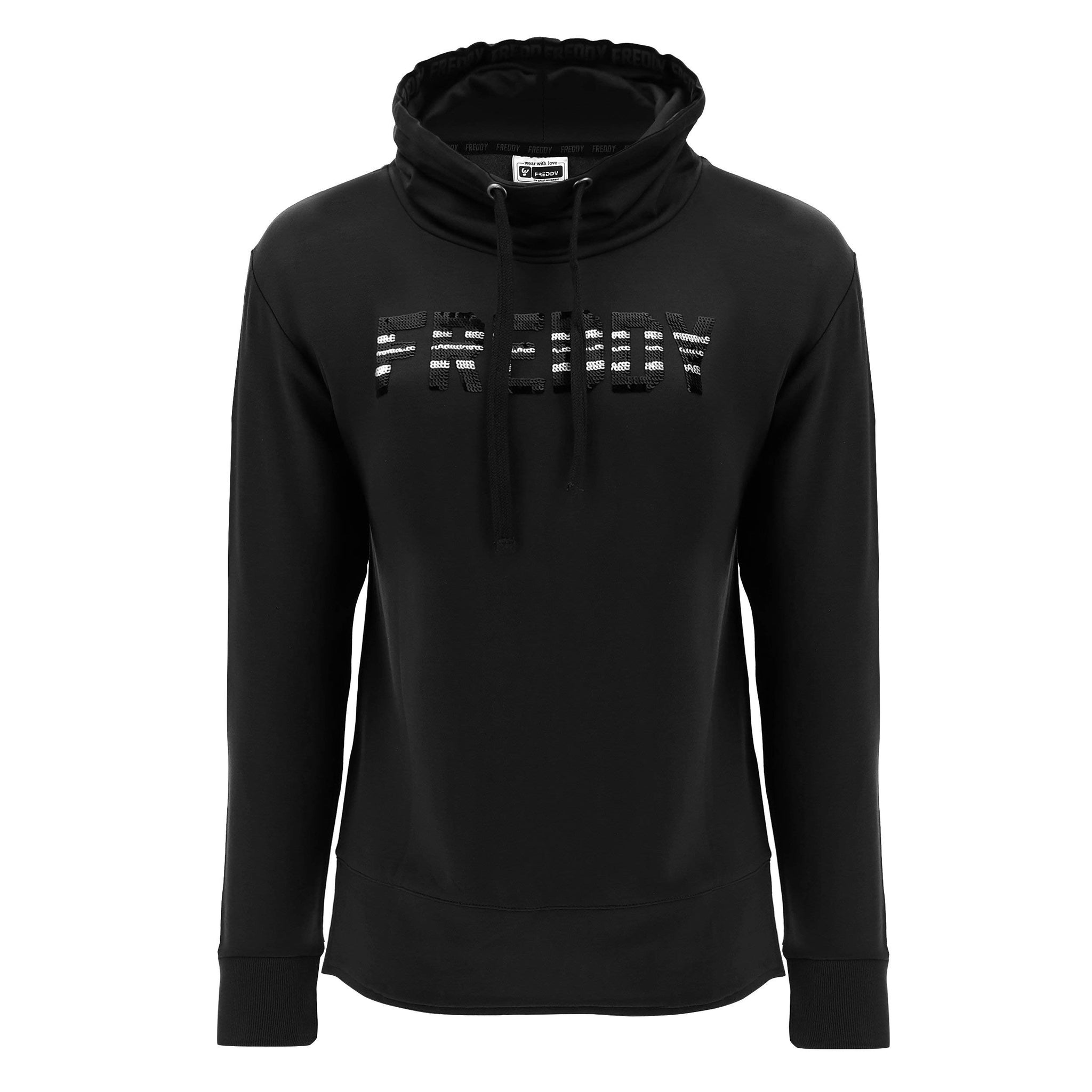 Felpa con collo alto ad anello regolato da coulisse e decorazione frontale in paillettes bicolore. Ha vestibilità regular, maniche con polsini in costina e fondo leggermente svasato. Capo ideale per la ginnastica e le attività all'insegna del movimento che si contraddistingue per il suo design avvolgente impreziosito dallo stile frizzante del logo FREDDY in paillettes e per la piacevole morbidezza e lucentezza dai toni satinati del tessuto in felpa viscosa. Con Freddy comfort e stile sono la cifra dei tuoi look sportivi e per il tempo libero.