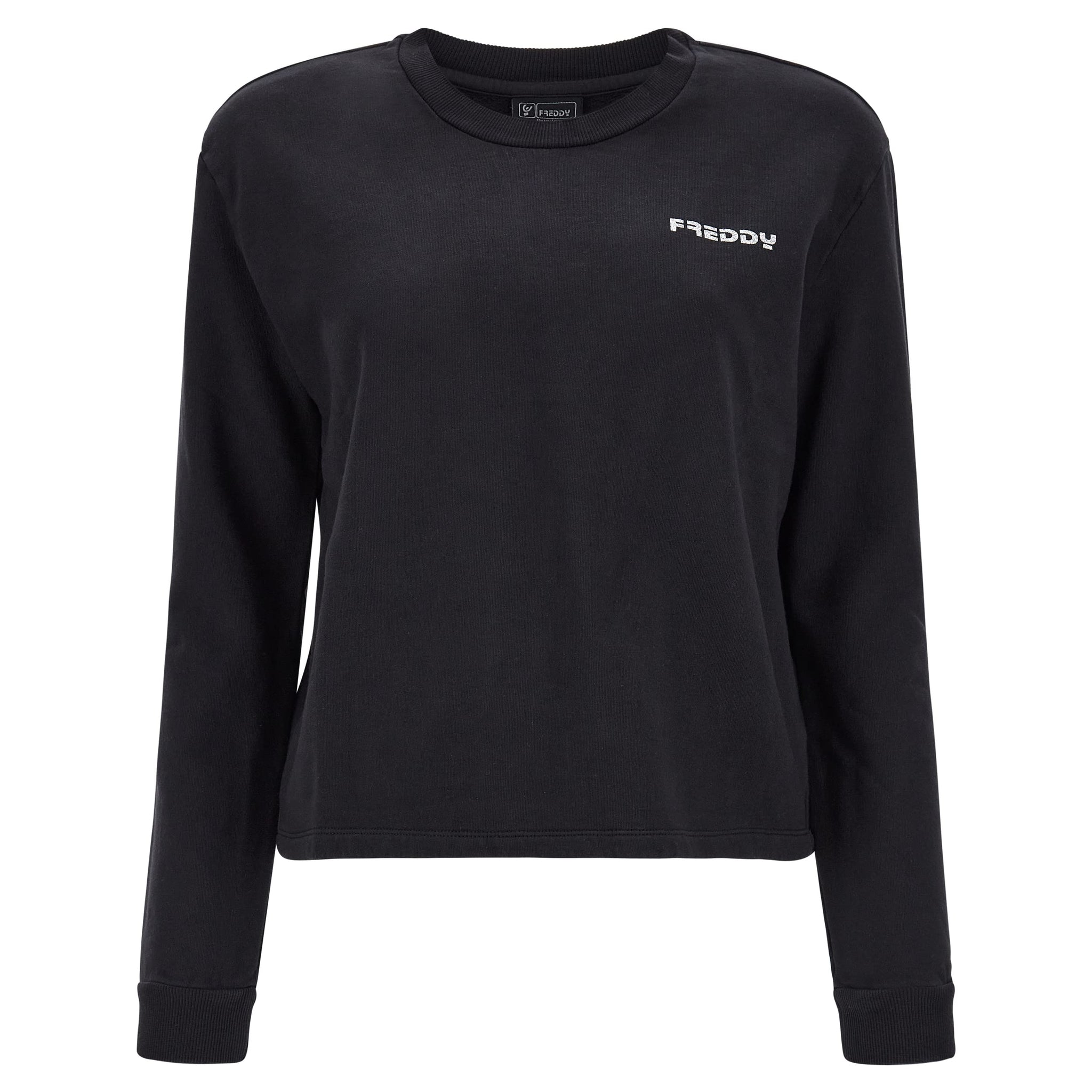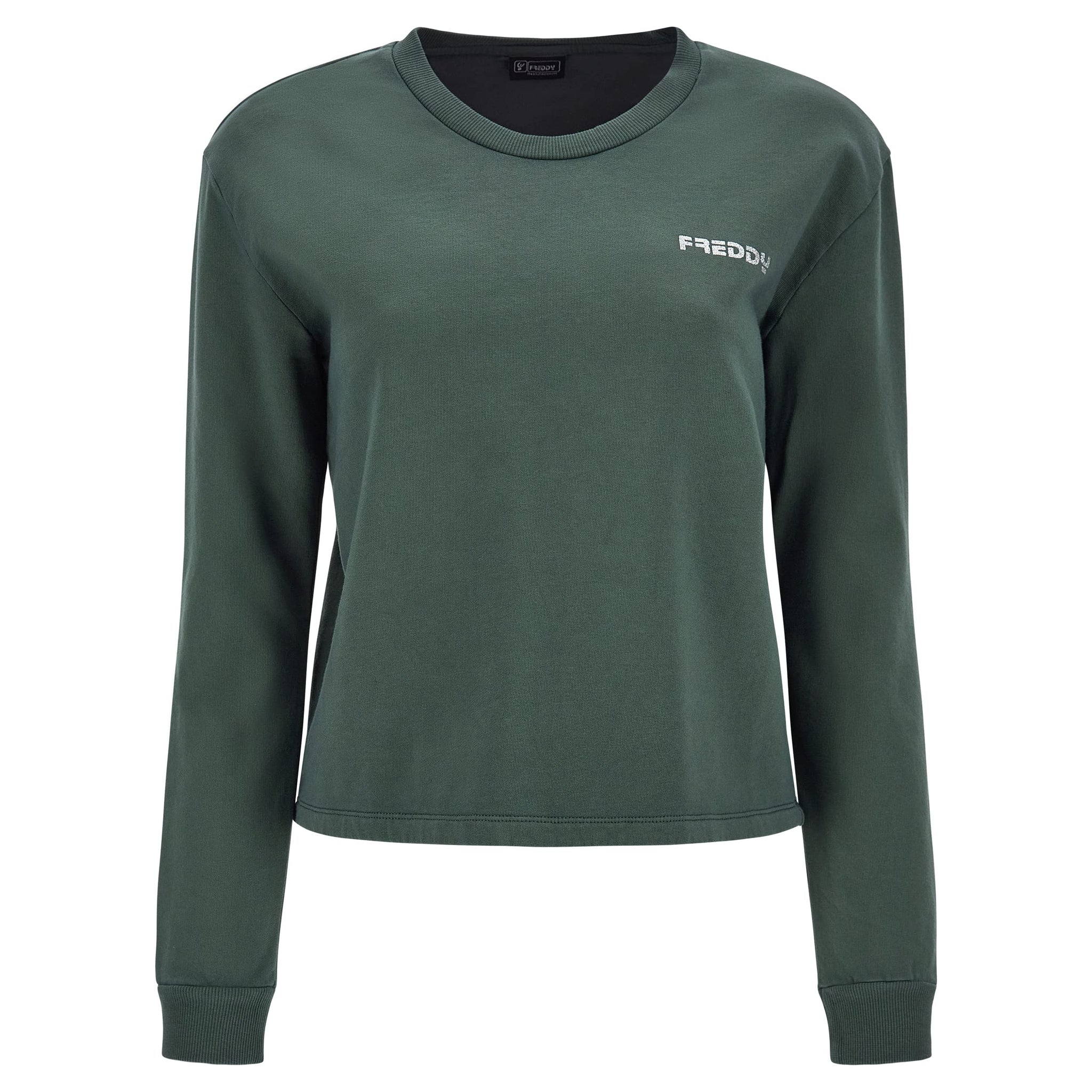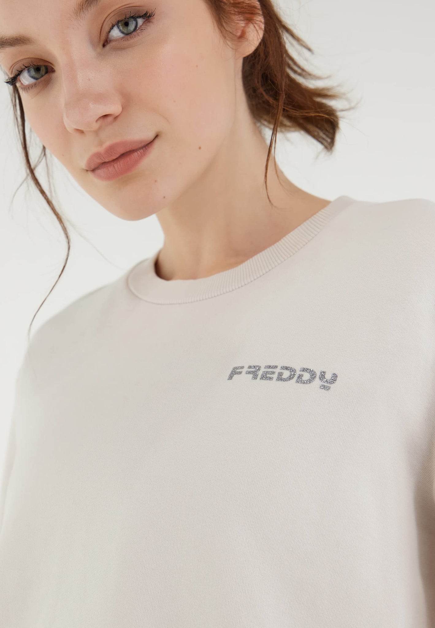 Felpa cropped con vestibilità comfort perfetta per le tue attività sportive e per il tempo libero dinamico. Il modello è realizzato in avvolgente felpa garzata tinta in capo e ha scollo a girocollo in costina, maniche lunghe con polsini in costina e logo Freddy in glitter sul petto. Il design corto in vita si intreccia con la morbidezza del tessuto nel donare comodità e ampiezza di movimento in ogni occasione.