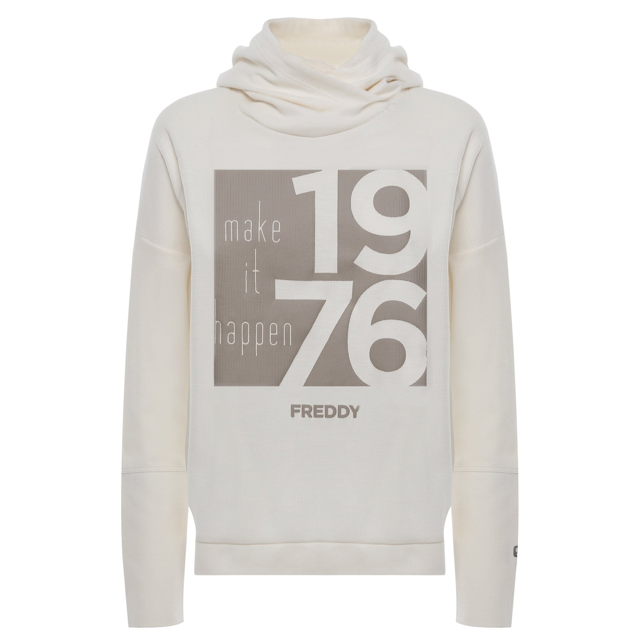 Felpa Collezione Academy in french terry fiammato tinto capo Vestibilità: regular, leggermente più ampia sulle spalle Tessuto: Flamed French Terry Scollo/Cappuccio: cappuccio ampio, con scollo incrociato Fondo: stretto Maniche: lunghe dritte Tasche: no Caratteristiche: Tessuto tinto in capo Maxi-Stampa sul fronte “Make it Happen 1976” Collezione: Academy è una collezione dalle vestibilità morbide, ispirate al mondo della danza. Realizzata interamente con tecnica di colorazione tinto in capo, che dona un aspetto used alla collezione, è impreziosita da applicazioni di paillettes ed inserti in pizzo.
