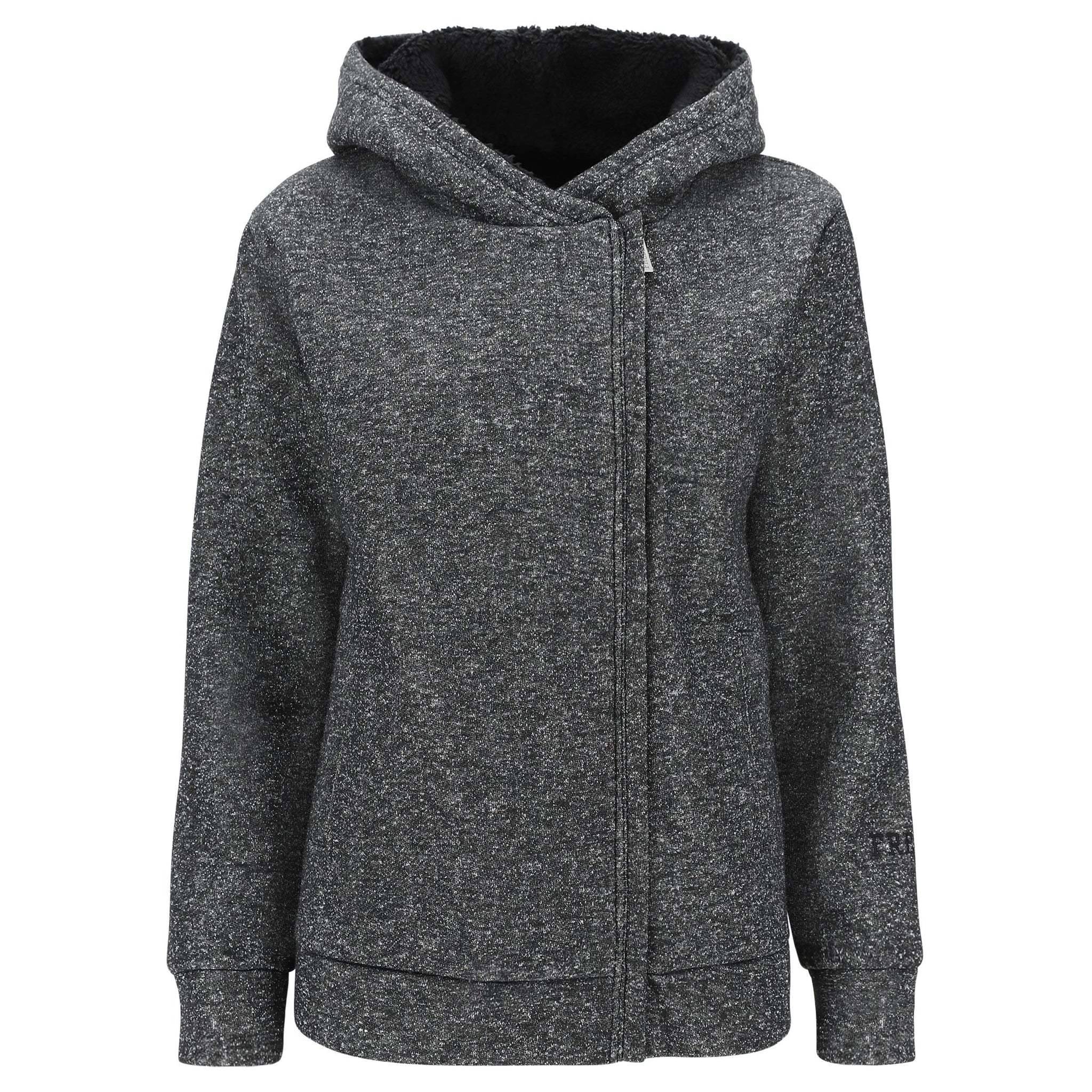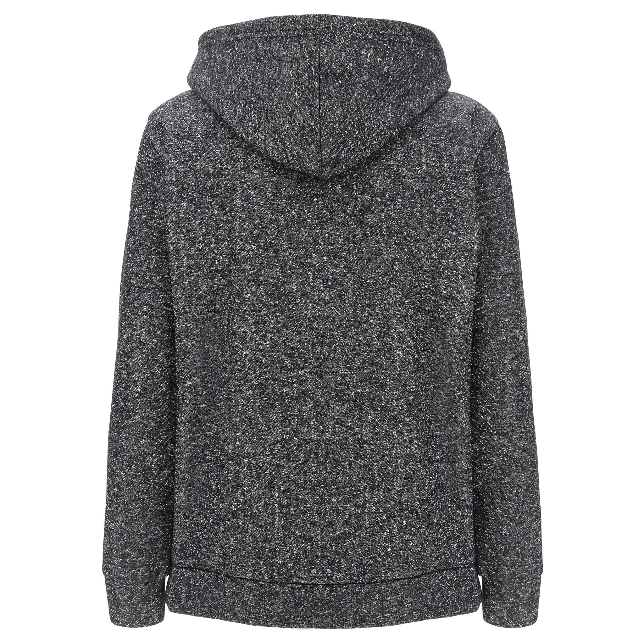 In lurex, filato dalla speciale lucentezza, con apertura a zip laterale sul petto e particolare cappuccio doppiato internamente in peluche.