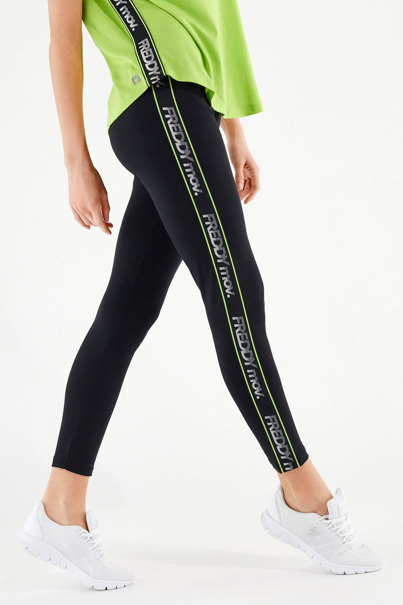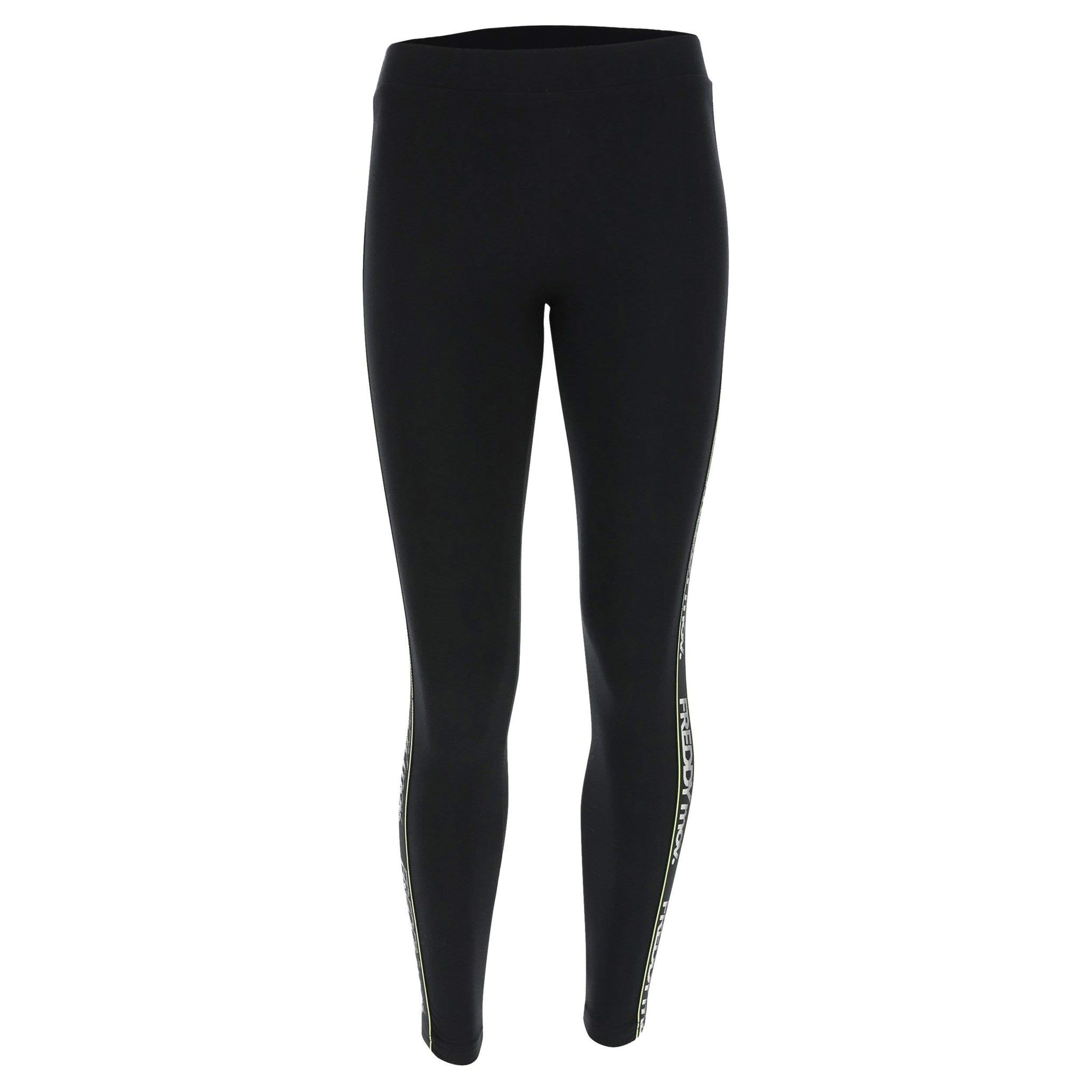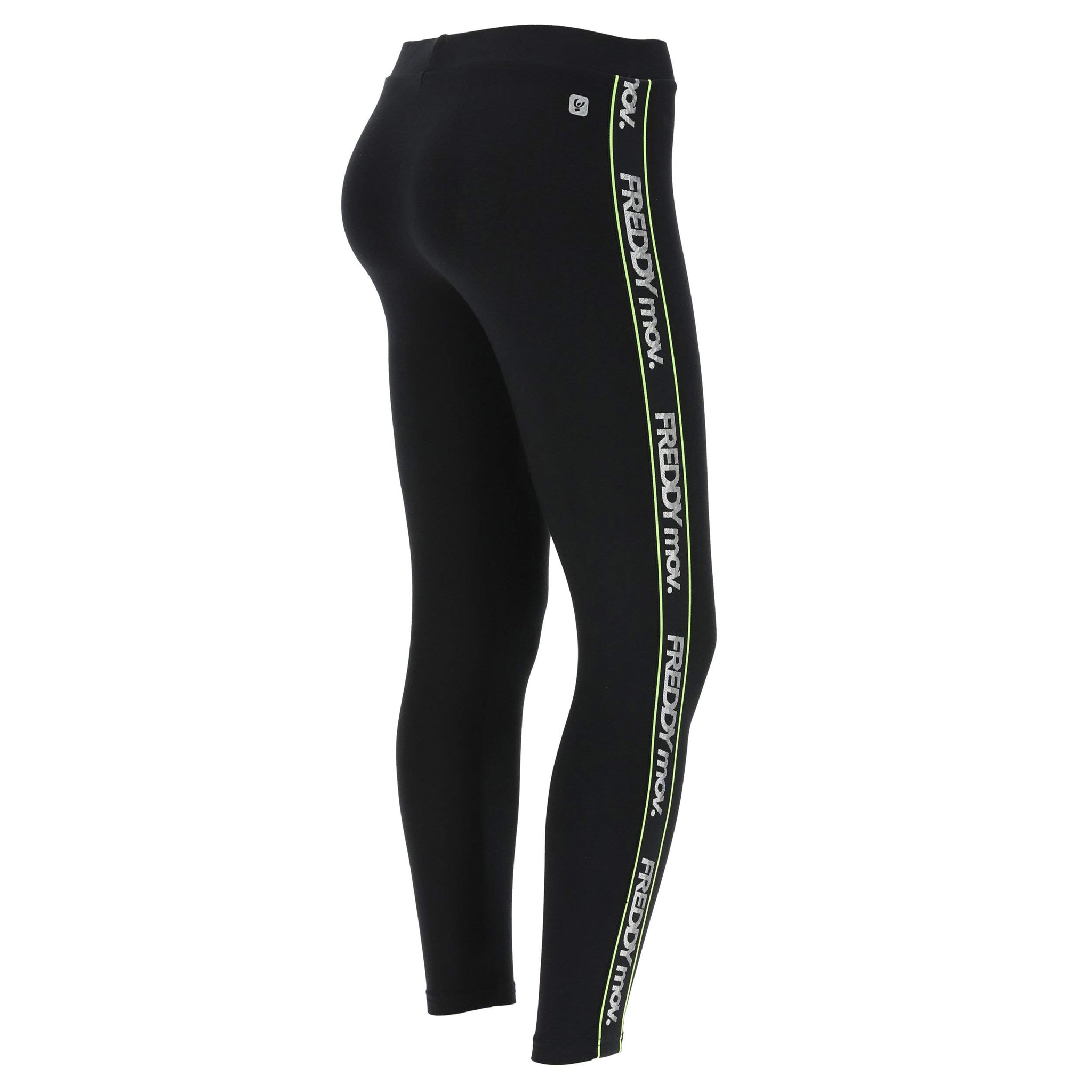 Leggings fitness in jersey pesante elasticizzato in colore nero con nastro jacquard logato FREDDY MOV. bordato in colore fluo che percorre le lunghezze. Hanno vita e lunghezza regular. Un piccolo logo Freddy sulla parte posteriore completa i dettagli di stile di questo capo adatto per il fitness e l'attività sportiva in generale grazie alla flessibilità del tessuto che favorisce ampiezza e libertà di movimento.