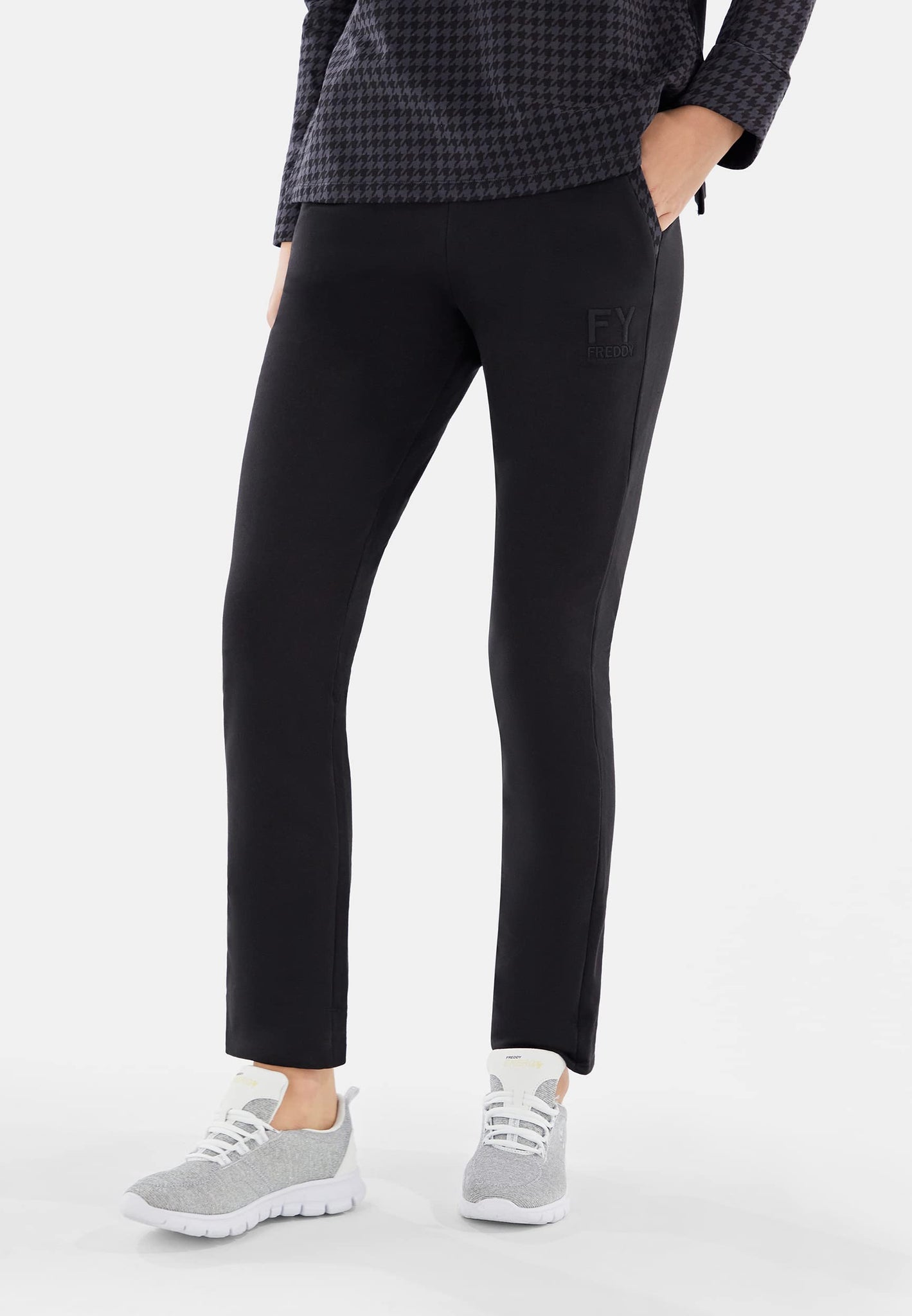 Pantaloni slim fit animati dalla bordatura delle tasche e dai risvolti a fondo gamba in fantasia pied de poule. Il modello presenta gamba dritta e tasche frontali alla francese. La stampa in tono del logo Freddy applicata sotto una tasca completa i dettegli di questo capo votato al piacere per la libertà di movimento con stile grazie al suo design, il morbido e avvolgente tessuto in felpa garzata elasticizzata e la vestibilità slim che segue le linee del corpo senza costrizioni.