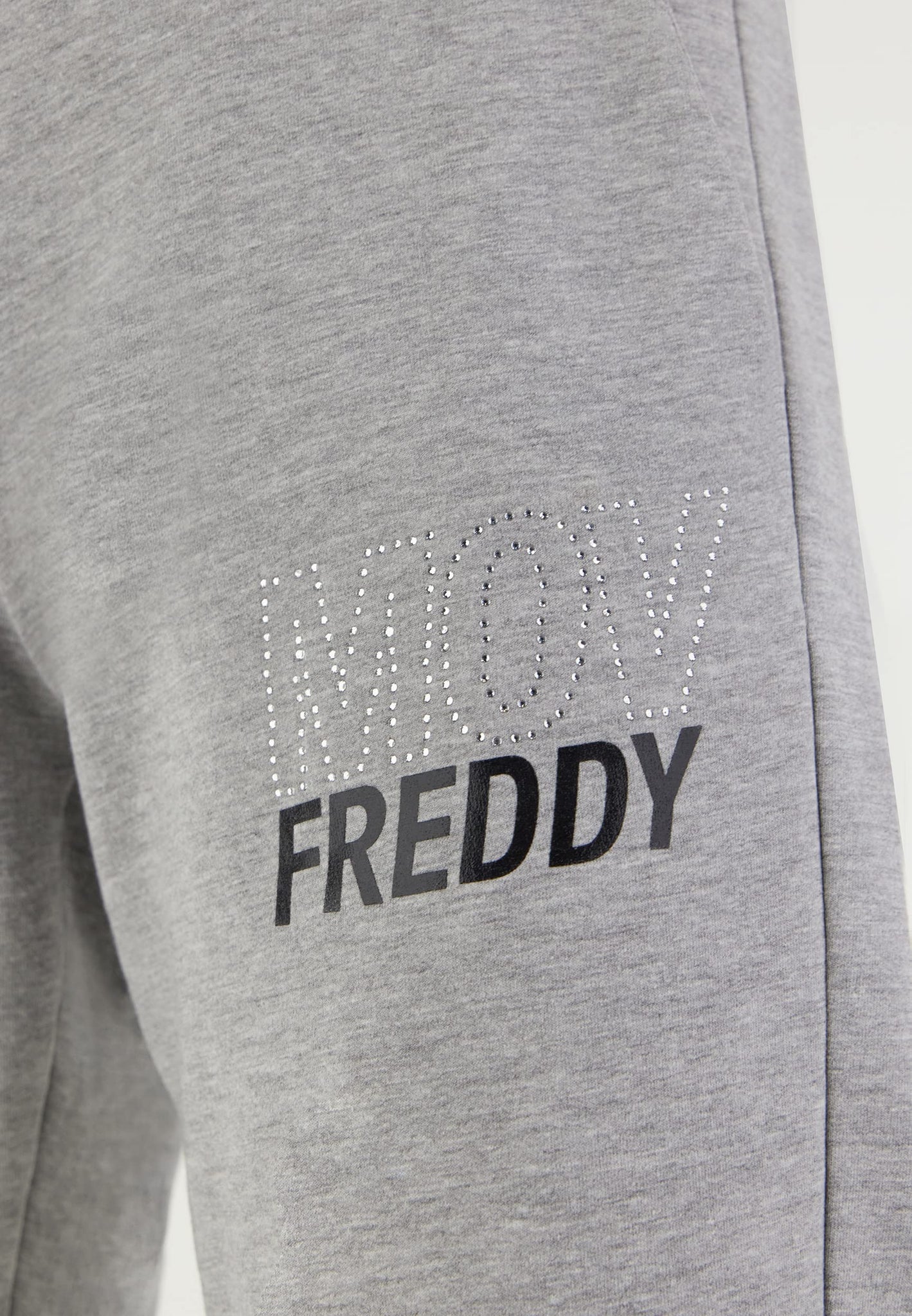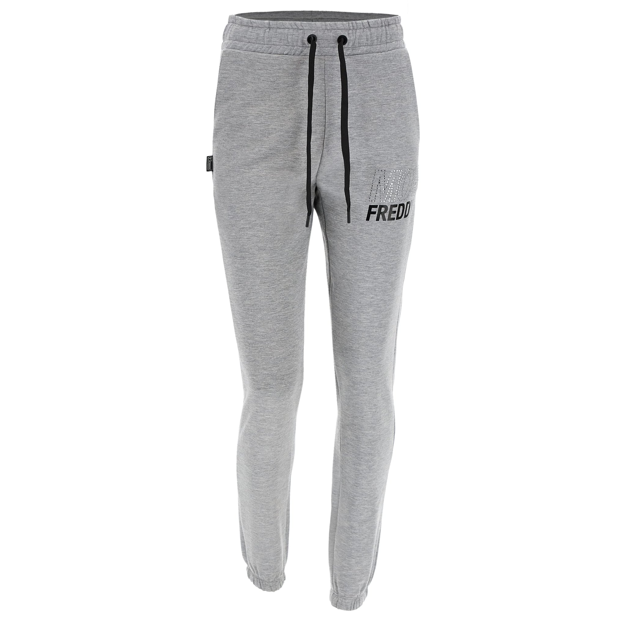 Pantaloni sportivi slim fit in avvolgente felpa garzata elasticizzata grigio mélange, decorati dalla grafica FREDDY MOV sotto la tasca realizzata con strass e stampa in colore nero lucido. Hanno vita regolata da coulisse, fondo con elastico che favorisce la tenuta e pratiche tasche frontali interne. Capo comodo che segue la linea della gamba senza costrizioni favorendo l’ampiezza di movimento grazie alla vestibilità slim e alla flessibilità del tessuto. Sono l’ideale per ginnastica, fitness e il tempo libero dinamico all’insegna della comodità.