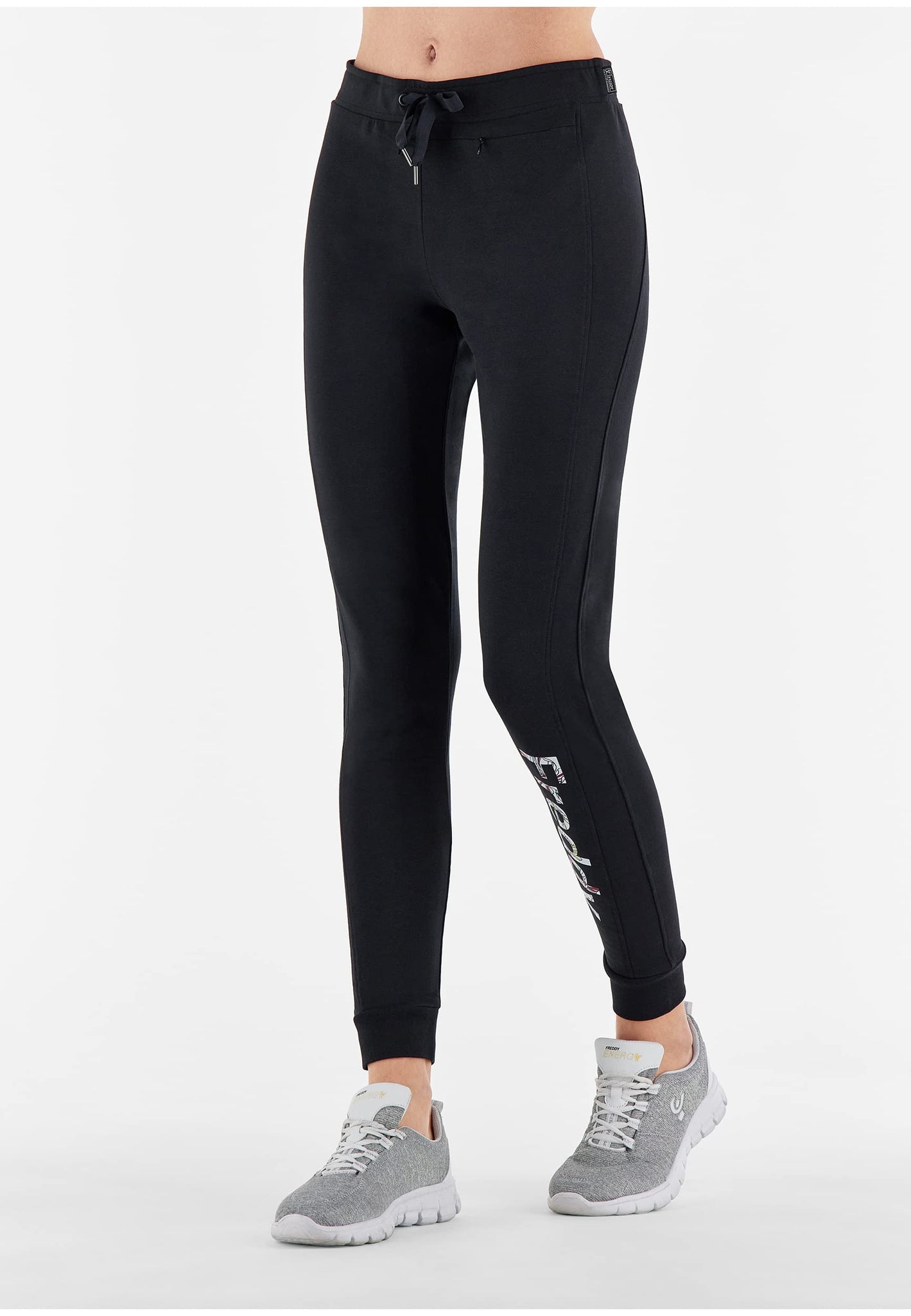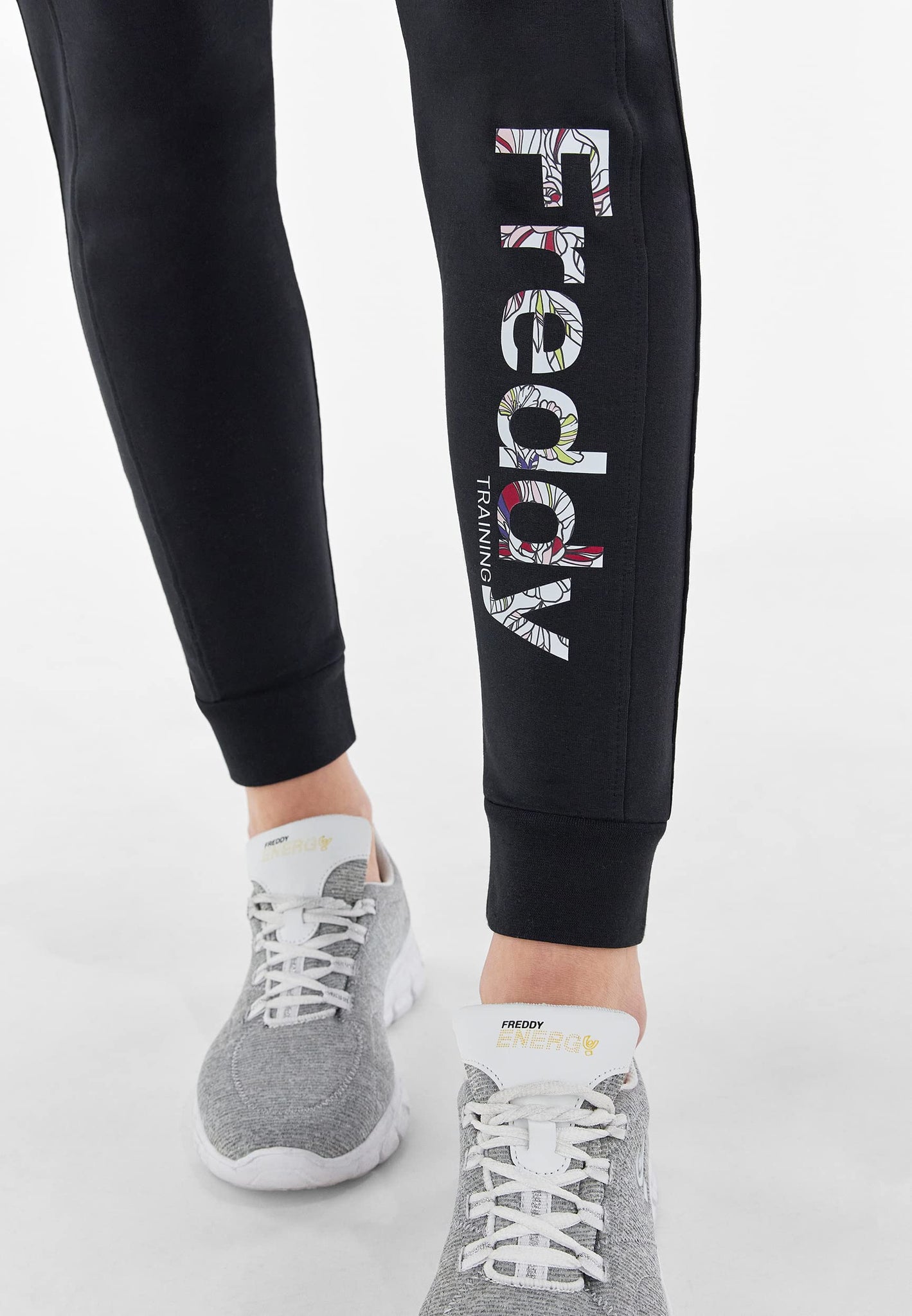Pantaloni elasticizzati in felpa leggera decorati a fondo gamba dalla stampa FREDDY TRAINING a fantasia floreale stilizzata con punti colore. Il modello presenta vita regolabile da coulisse, pratico taschino con zip invisibile sulla cintura, tasche frontali interne e fondo a polsino in costina. La vestibilità slim si unisce alla flessibilità del tessuto in french terry elasticizzato nel seguire le linee del corpo donando ampiezza di movimento. Capo comodo ideale per il fitness e lo sport in generale ma anche per il tempo libero che punta al comfort con stile.