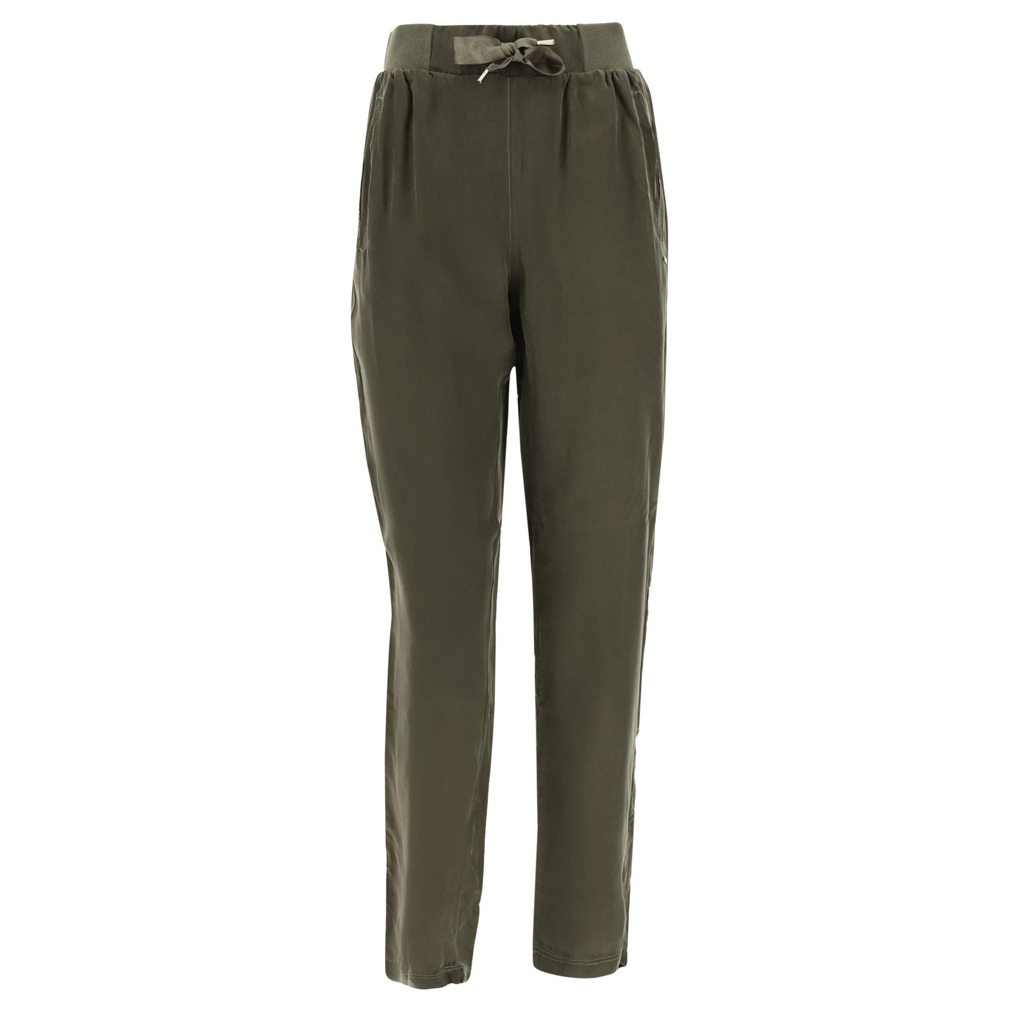 Pantaloni con taglio tapered in morbido e lucente cupro, una fibra vegetale dall'effetto setoso e piacevole sulla pelle, rinomata per la sua flessibilità e freschezza. Hanno vita in costina regolabile con coulisse larga in tono colore, tasche anteriori interne, tasche posteriori applicate e vestibilità regular. Capo particolarmente confortevole e piacevole da indossare grazie al suo design comodo dalle linee fluide e dal taglio leggermente più ampio su cosce e fianchi e più stretto sul fondo a cui si unisce la piacevolezza del tessuto in fibra vegetale dall'effetto fresco e setoso sulla pelle.