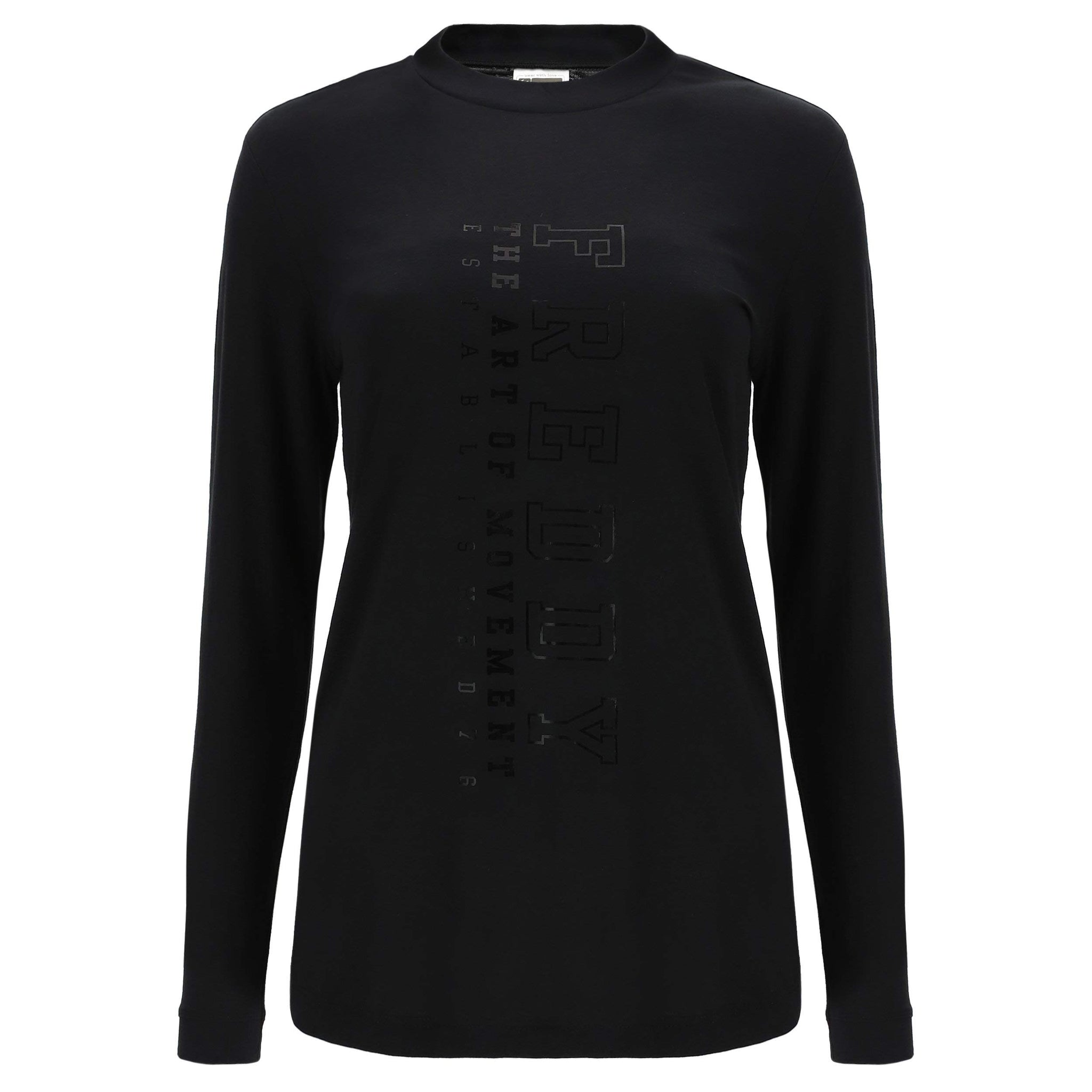 Il modello ha maniche lunghe, scollo a girocollo e fondo dritto, ed è decorato con stampa a lettering verticale “Freddy - The art of movement - Established 76”.