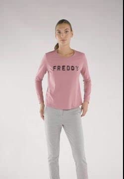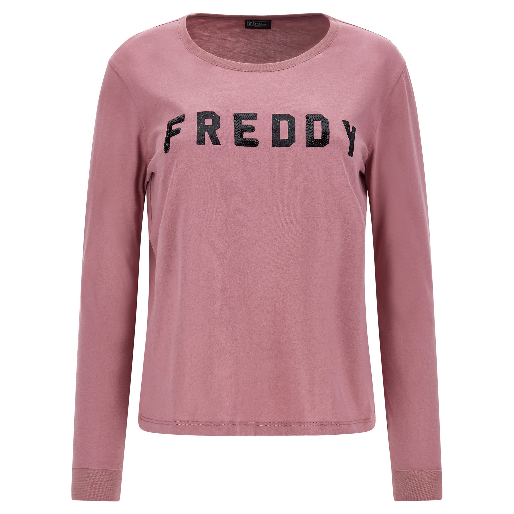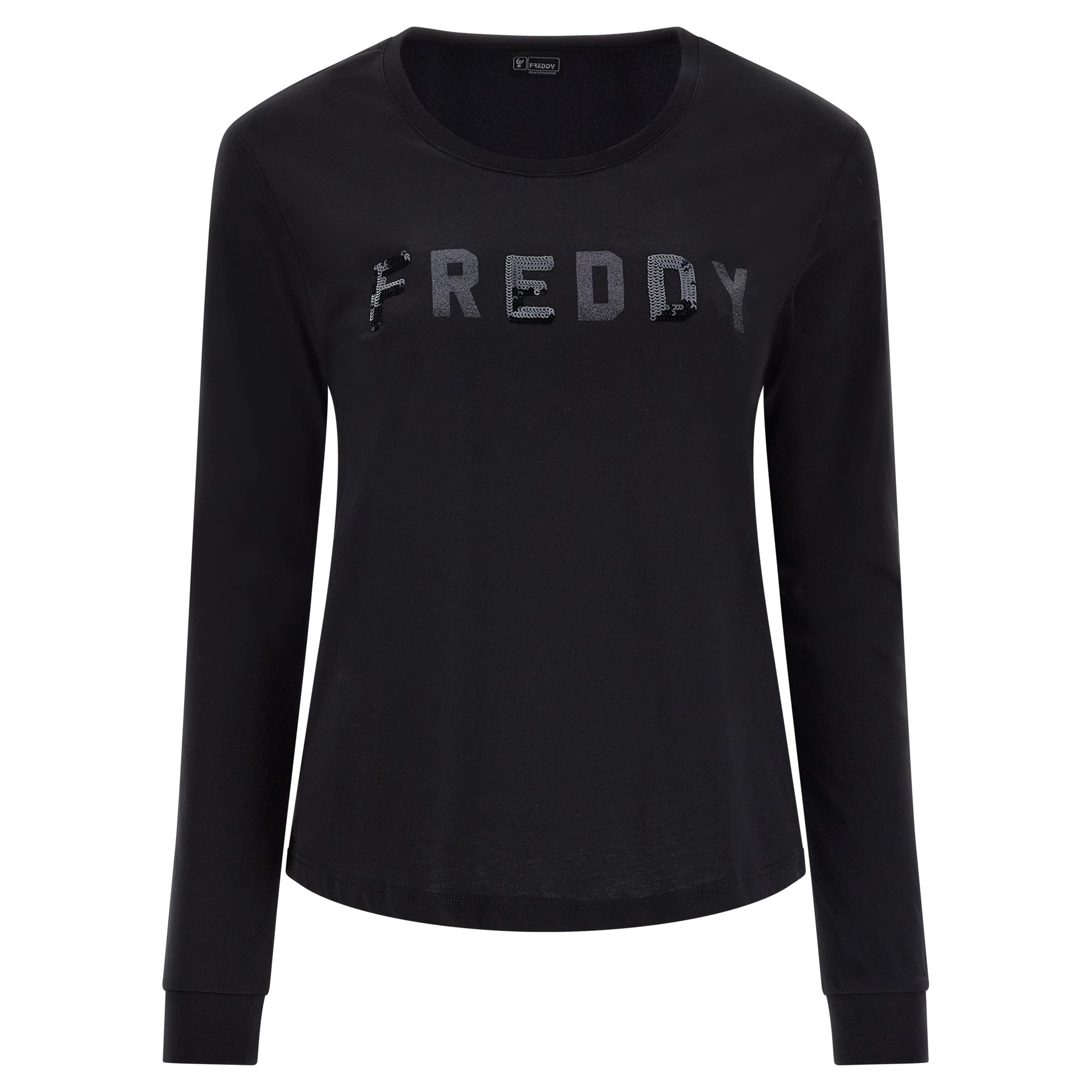 T-shirt con vestibilità comfort decorata sulla parte frontale dalla grande grafica FREDDY in paillettes nere. Il modello ha scollo rotondo, manica lunga e fondo dritto. Il fit ampio si unisce alla naturale flessibilità del tessuto in jersey di cotone leggero nel celebrare la comodità.