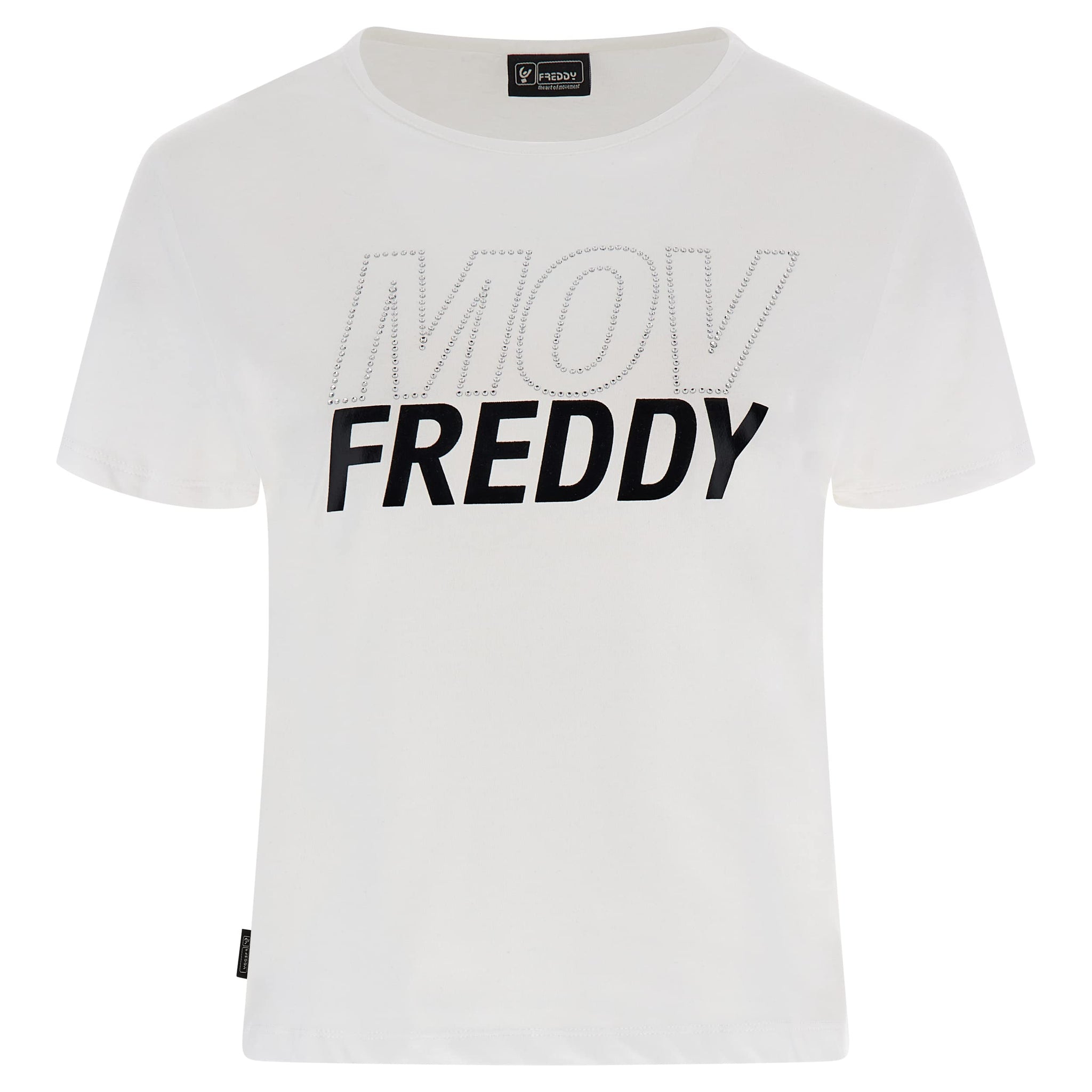 T-shirt cropped in jersey leggero caratterizzata dalla grafica a lettering MOV FREDDY in strass argento e in colore nero lucido che richiama l’animo Freddy in cui azione, movimento e stile sono i protagonisti. Ha scollo a girocollo, maniche corte e fondo dritto. Un capo comodo e dinamico pensato per accompagnare i tuoi movimenti in libertà durante l’attività sportiva e il tempo libero.