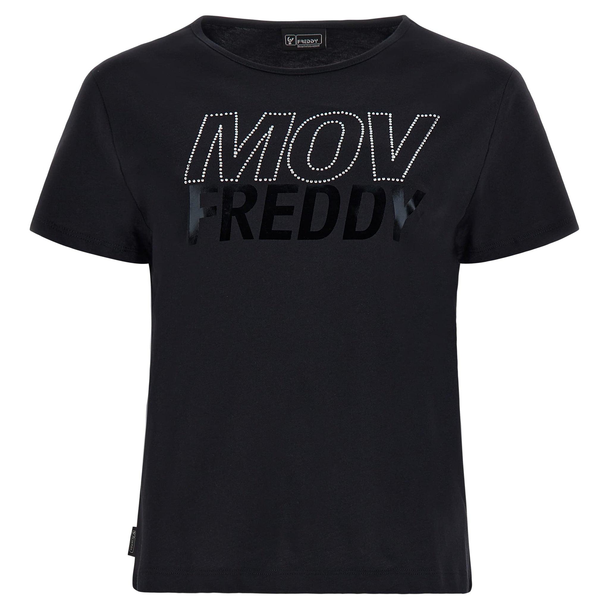 • T-shirt cropped con grafica FREDDY MOV strass e nero lucido