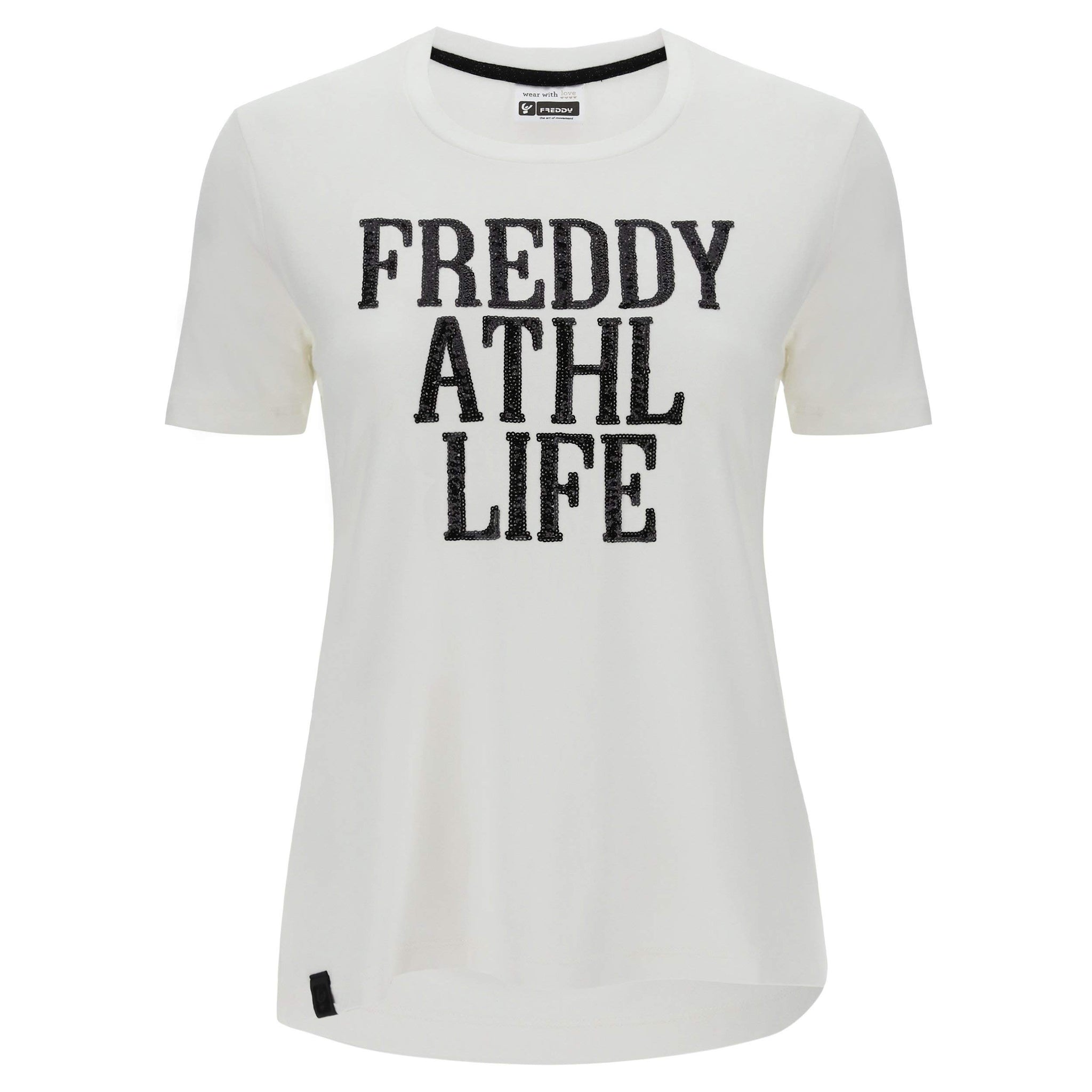 T-shirt in jersey viscosa elasticizzato con scritta composta da paillettes sul fronte. Ha scollo a girocollo, maniche corte, fondo dritto e vestibilità regular. Il carattere glamour dato dalla decorazione in paillettes si unisce alle proprietà del tessuto dal tono lucente e satinato che segue flessuosamente le forme del corpo nel rendere questo capo l'ideale per completare con personalità i tuoi outfit all'insegna del comfort e dello stile, in pieno mood Freddy.