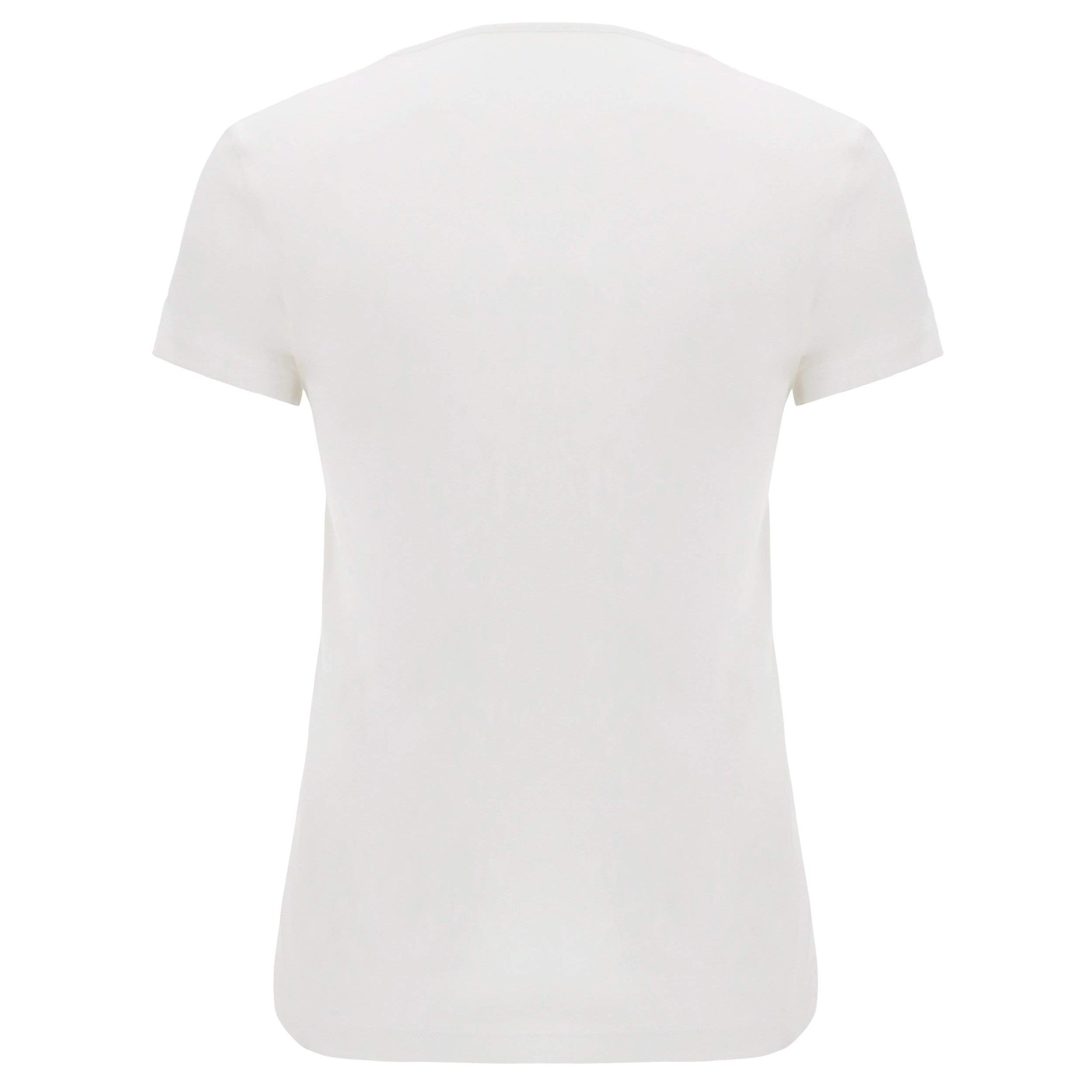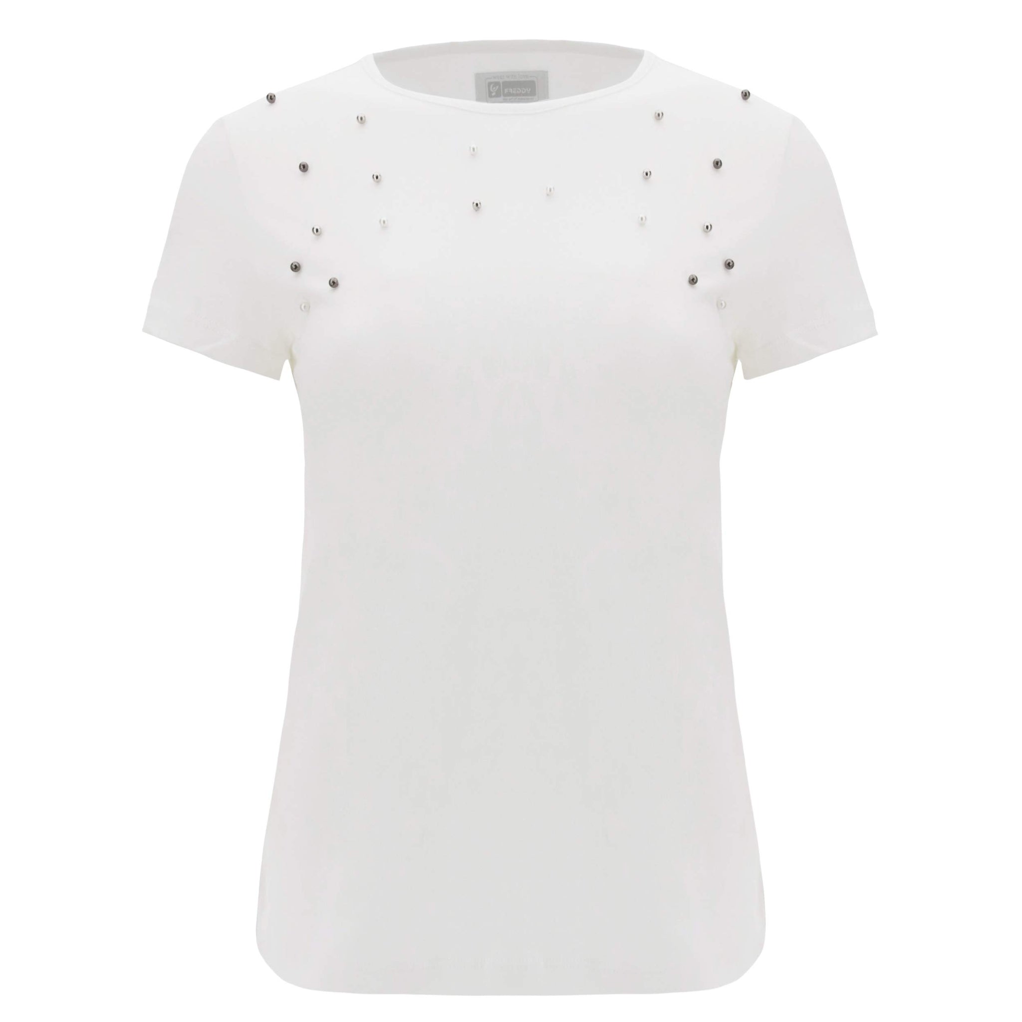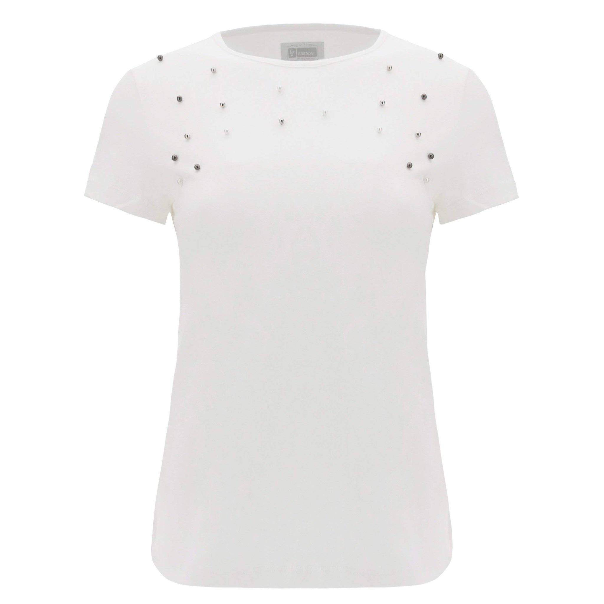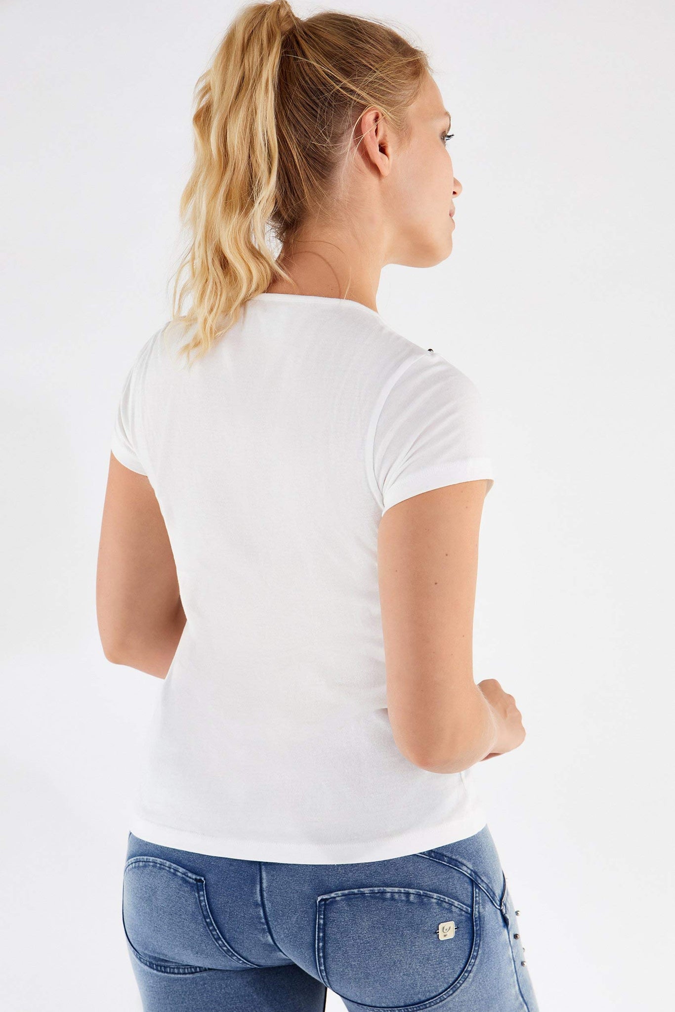 T-shirt a maniche corte in morbido jersey bianco con carré frontale decorato da perline di diversa tonalità. Il modello presenta scollo tondo, fondo dritto e vestibilità regular. Il logo Freddy applicato sul fondo completa i dettagli di stile. Capo piacevole da indossare grazie al tessuto che segue morbidamente le linee del corpo e ne asseconda i movimenti. Il design lineare e al contempo femminile si unisce al tono chic della decorazione nel donare al capo una personalità unica ricca di stile.