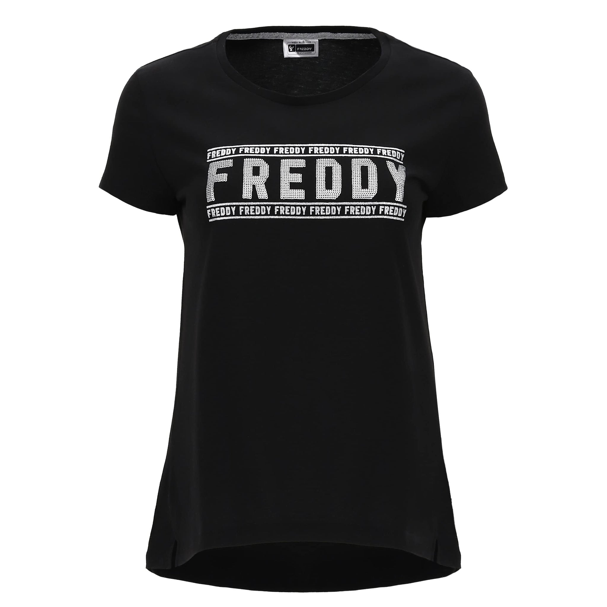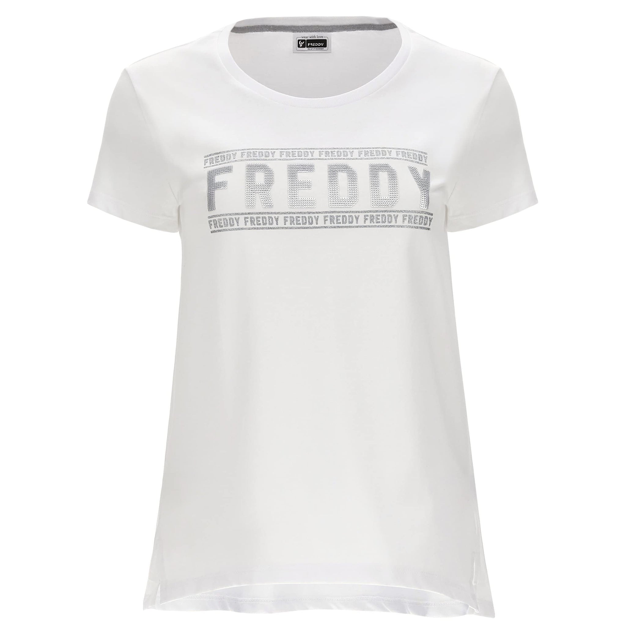 T-shirt dalle linee morbide enfatizzate da piccoli spacchi sul fondo e decorata dalla scritta FREDDY in paillettes in argento opaco incorniciato da due bande orizzontali logate in glitter argento. Ha scollo tondo, maniche corte, parte posteriore più lunga e vestibilità regular. Il design ricco di dettagli di stile si unisce alla morbidezza del tessuto in jersey di cotone leggero nel donare ampiezza di movimento per la pratica di ginnastica e per il tempo libero dinamico all’insegna della comodità e del piacere per lo stile