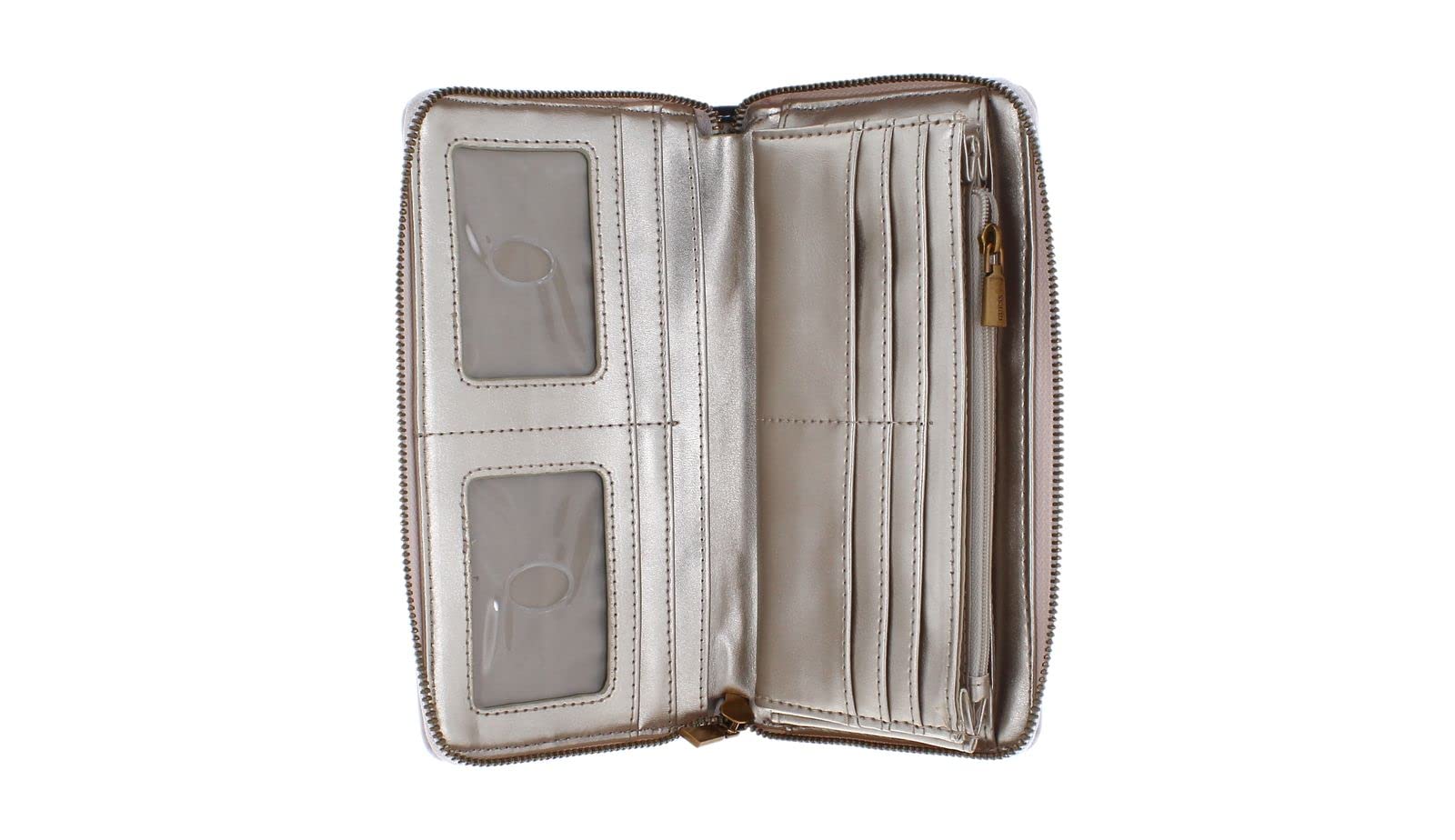 Attrezzatura borsa:borsa è chiuso con cerniera14 scomparti per carte di credito, carte di debito, biglietti da visita ecc.2 scomparti laterali per carta d'identità, calendario, foto ecc.2 vani di visualizzazione2 scomparti per banconote1 scomparto con cerniera per monete / spiccioliIl logo GUESS è chiaramente visibile